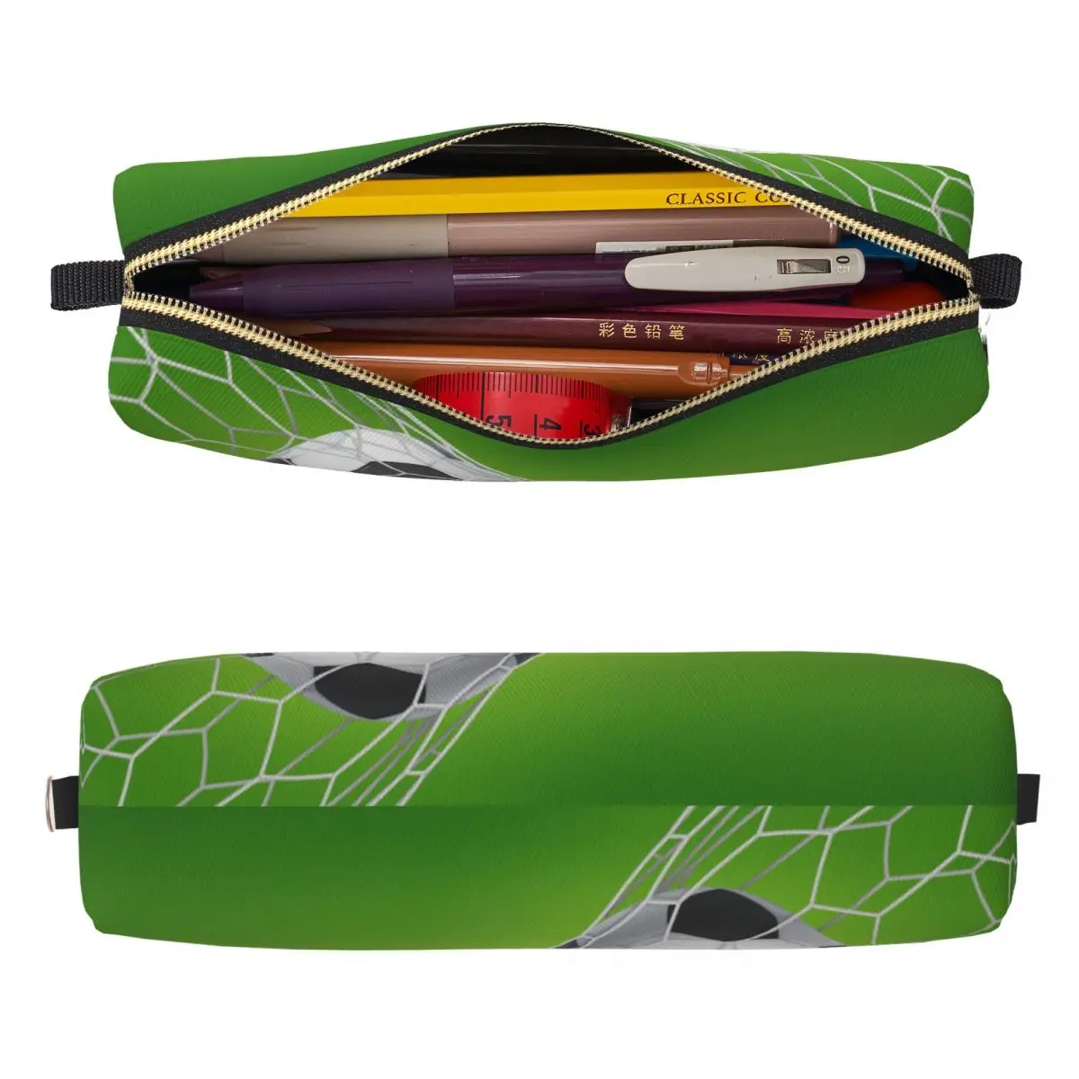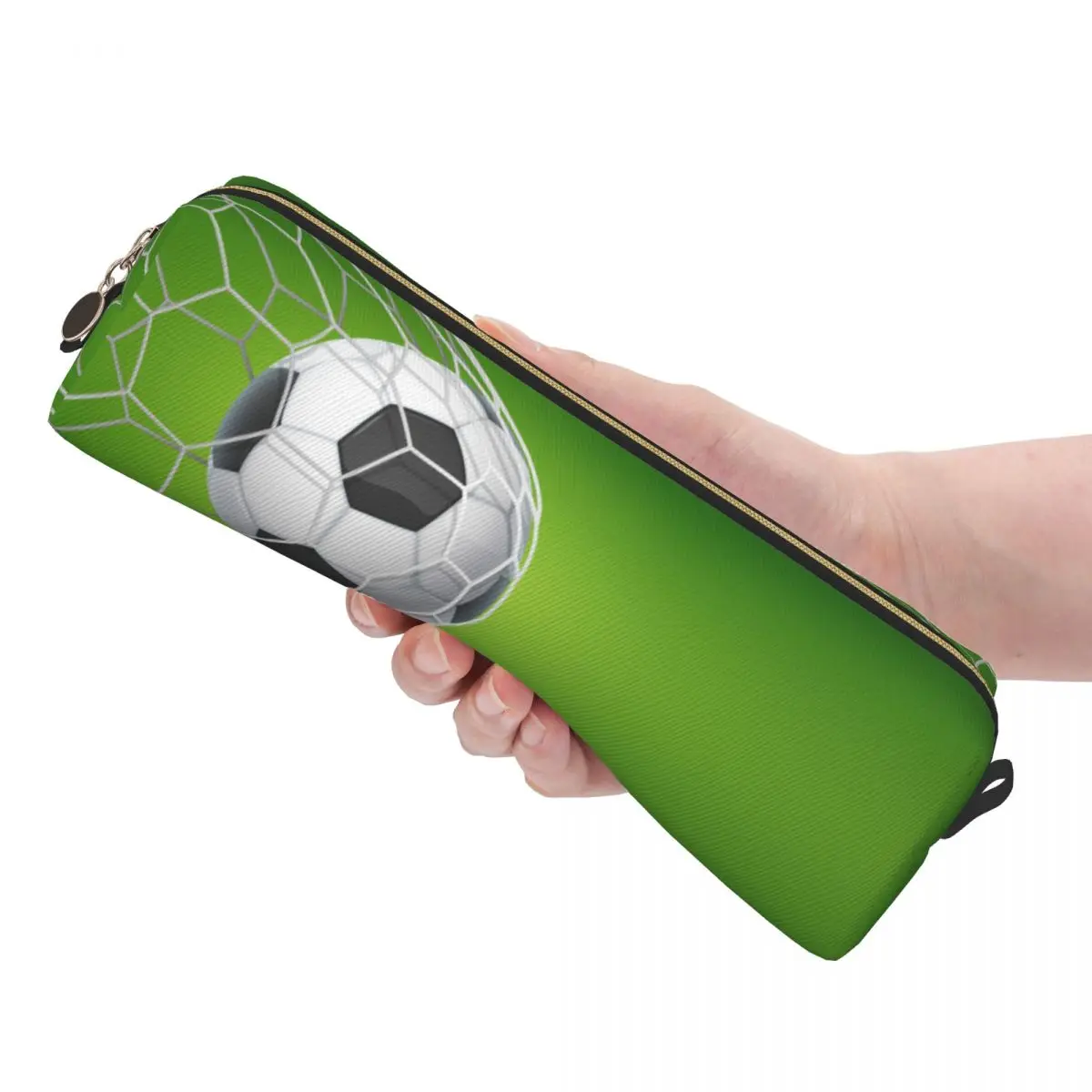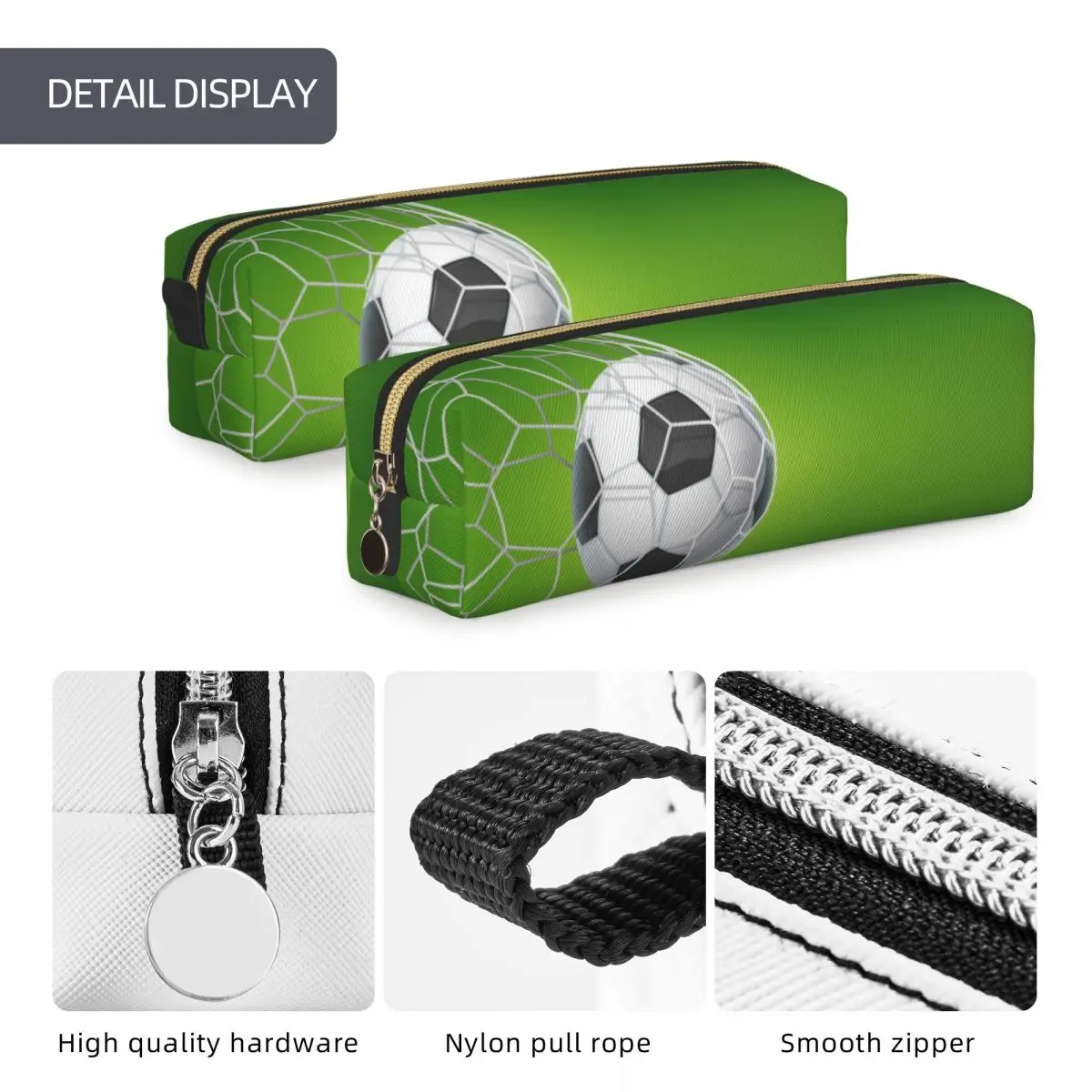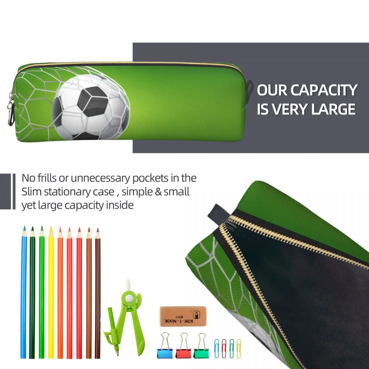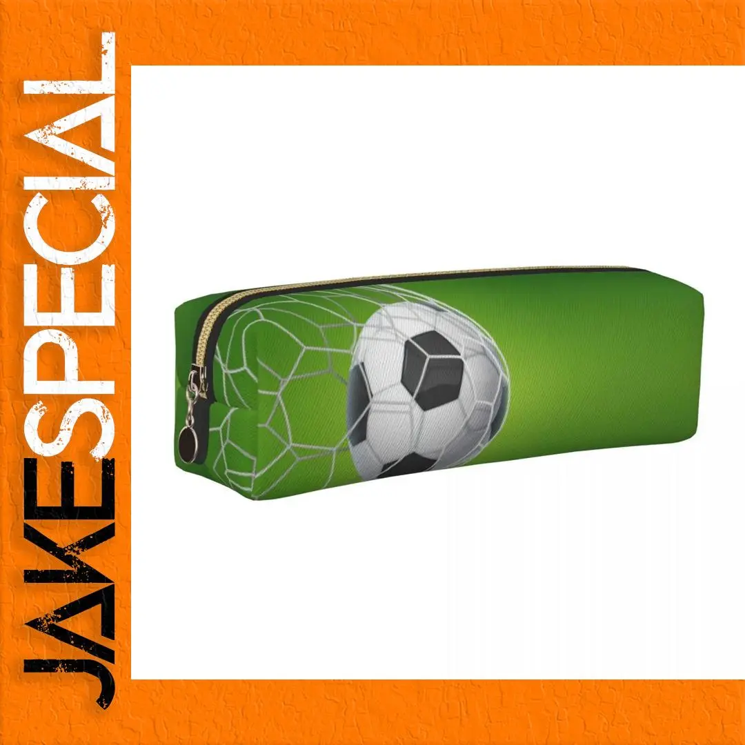 Embrace your sporty side with this Cute Soccer Football Pencil Case, perfect for students and soccer enthusiasts alike. This vibrant green pencil case, with its smooth leather-like texture, offers both style and functionality. The lively design prominently showcases a graphic soccer ball, complete with a motion effect and a subtle soccer net in the background. The compact and practical rectangular shape features rounded edges, making it easy to store writing instruments and stationery. A metallic gold zipper and circular pull tab add a touch of elegance to this wonderfully practical accessory. Feel the joy of owning this pencil case that beautifully represents your passion for sports.