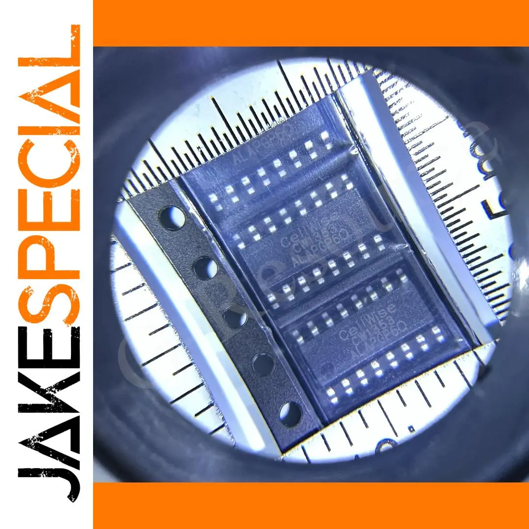 This set of 10 CW1353ALAP SOP-16 logic ICs features a built-in balanced 4-5 series lithium protection circuit, designed for reliable lithium battery management. Each compact rectangular chip has a matte black finish with small metallic pins along the longer sides, ensuring precise and secure circuit connections. White markings on the top surface display the model number for easy identification. The chips are housed in a transparent anti-static carrier, emphasizing their small size of approximately 4-5 millimeters in width and showcasing their technical sophistication. Ideal for electronic applications requiring high-quality lithium protection, these ICs combine durability, accuracy, and efficiency in a sleek, functional package.