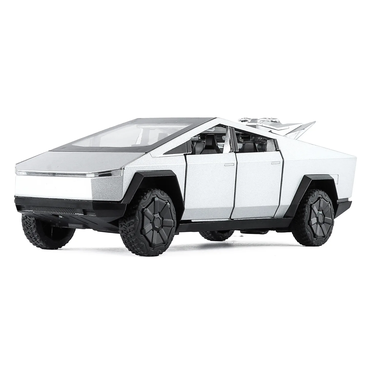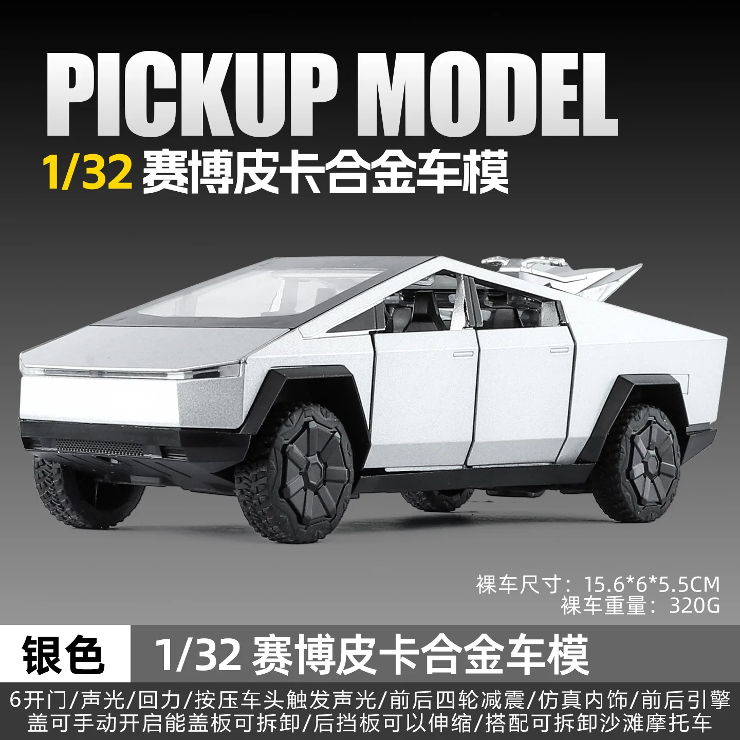This 1:32 scale model of a Cyber Off-road Pickup by WELLY showcases a striking silver alloy body with a modern, angular design, embodying a futuristic aesthetic. The model features four detailed but fixed doors, clear plastic windows revealing a minimally detailed interior, and robust black tires mounted on distinctive black alloy wheels for an impressive off-road look. The vehicle includes sound and light functionalities, powered by a button battery. Alongside it, a sleek mini ATV in black plastic with silver detailing enhances the sporty appeal. Perfect as a decorative piece or collectible, this model is designed for discerning enthusiasts.