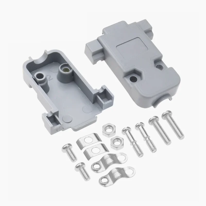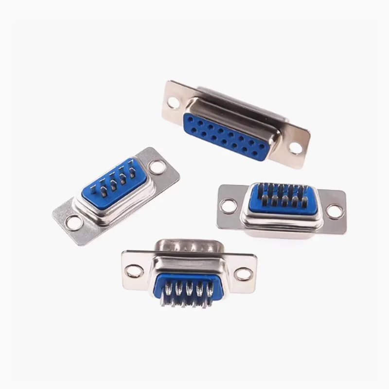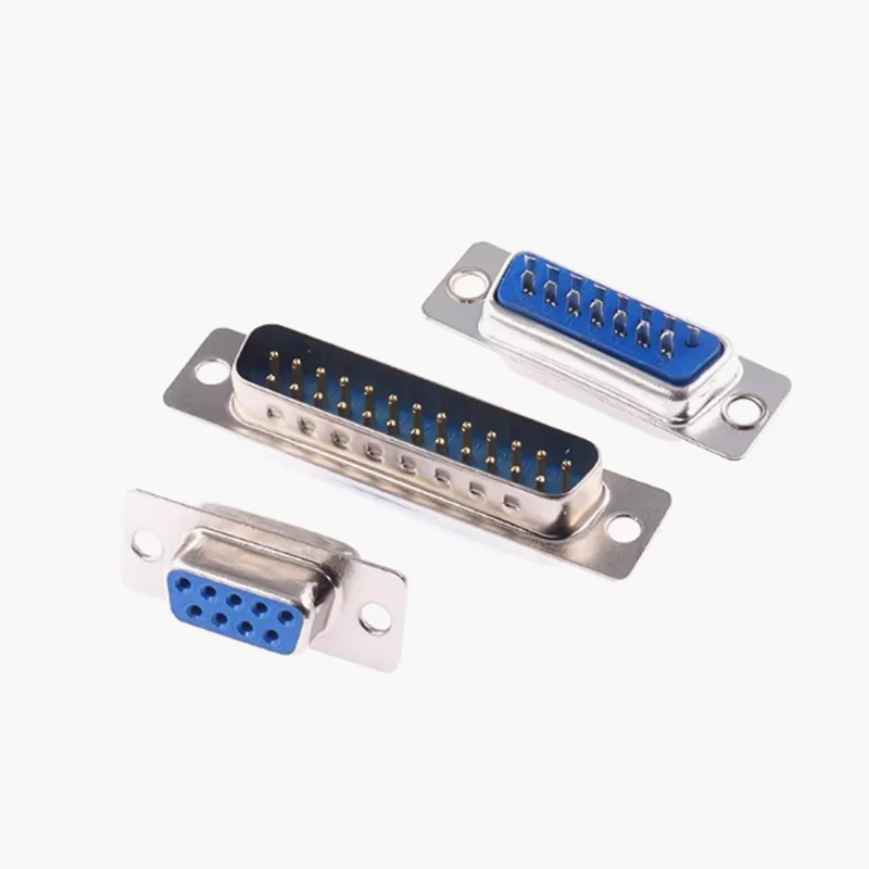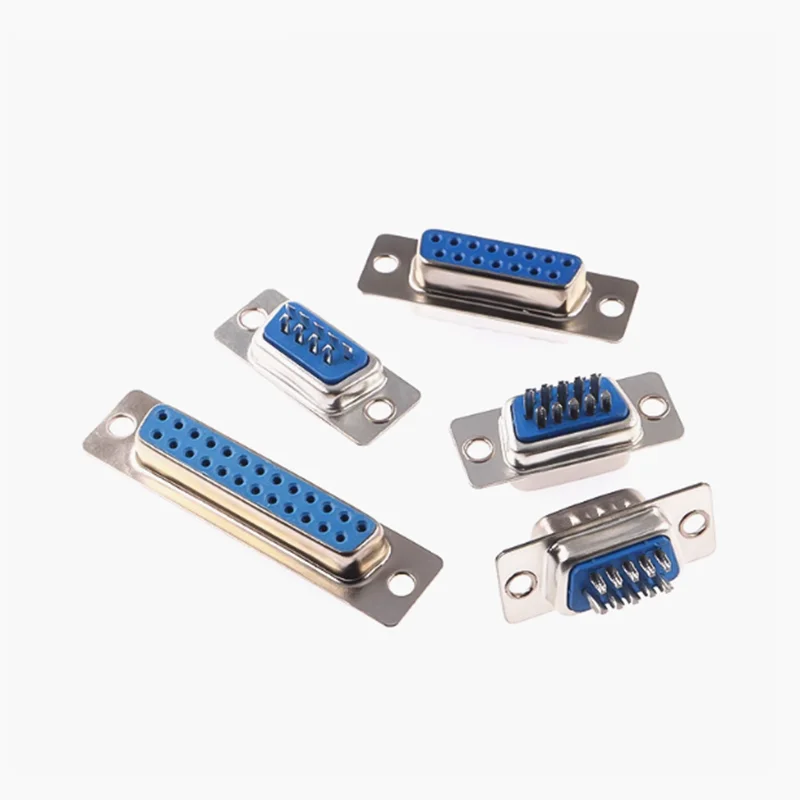 This set of D-sub connectors is designed for reliable serial port connections, available in 9, 15, 25, and 37 pin configurations with male and female options. Featuring solder-type connection ports in straight mount with 2-row layouts, these connectors have a voltage rating of 220V. The collection includes 5-piece sets for each size—DB9, DB15, DB25, and DB37—as well as single housings, perfect for various electronic and industrial applications. Built with durable metallic shells in a polished, silvery finish and vibrant blue plastic insulators, these connectors combine a sleek, industrial aesthetic with functional precision.