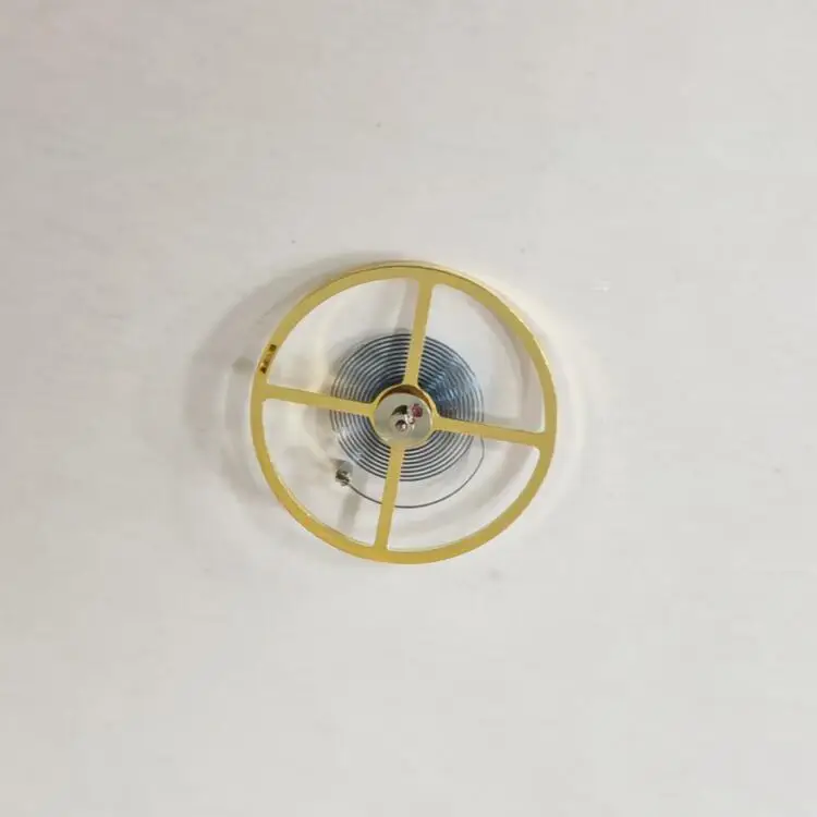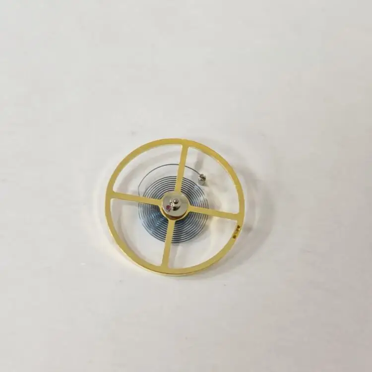 Enhance your watch repair projects with this exquisite balance wheel designed for the Dandong 4130 watch movement. Weighing just 10 grams, this elegantly crafted piece features a shiny gold-toned outer rim with four evenly spaced spokes, and a central silver coiled spring that provides essential tension for optimal performance. A small white dot on the rim serves as a calibration marker, elevating both its aesthetic and functional appeal. This replacement accessory is a vital component for maintaining the integrity of your Dandong 4130 movement, making it an essential addition to your watch repair toolkit.