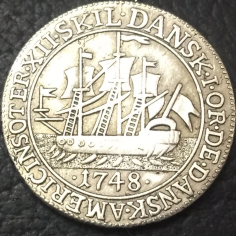 Prepare to enhance your collection with this meticulously crafted replica of the 1748 Danish West Indies 12 Skilling coin. Designed to reflect authentic antique beauty, this coin features a detailed, silver-toned surface with an aged, textured finish that evokes centuries-old craftsmanship. The central motif showcases a realistic sailing ship with multiple masts and sails, surrounded by elaborate rigging and a textured water base, capturing maritime history. Encircling the design, a raised inscription in European-style lettering and a border of tiny raised dots add to its vintage charm. Ideal for history enthusiasts or collectors, this piece combines European elegance with maritime adventure, offering a historical glimpse through an engaging, antique-style artifact.