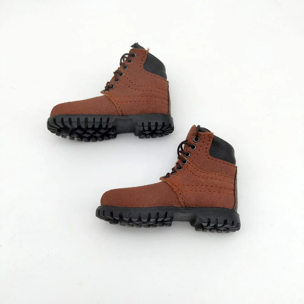 Introducing the Dark Brown Low Top Boots for 1/6 Scale Male Soldier Action Figures, crafted from durable PVC material. These meticulously detailed boots feature a rich dark brown color with a slightly lighter brown shade for the main body. The solid, not hollow design incorporates realistic elements such as small eyelets for black laces, visible stitching for authenticity, and a stylish black ankle top that contrasts with the brown. The ruggedly textured sole enhances the combat boot aesthetic, making them perfect for dynamic poses and displays. These boots are specifically designed for dolls with detachable feet, ensuring a perfect fit.