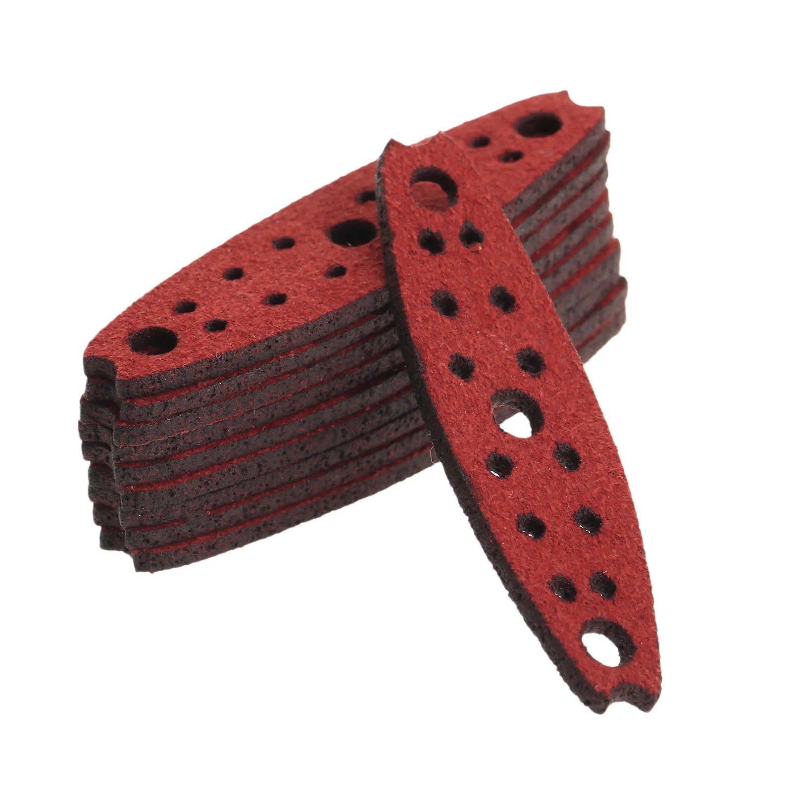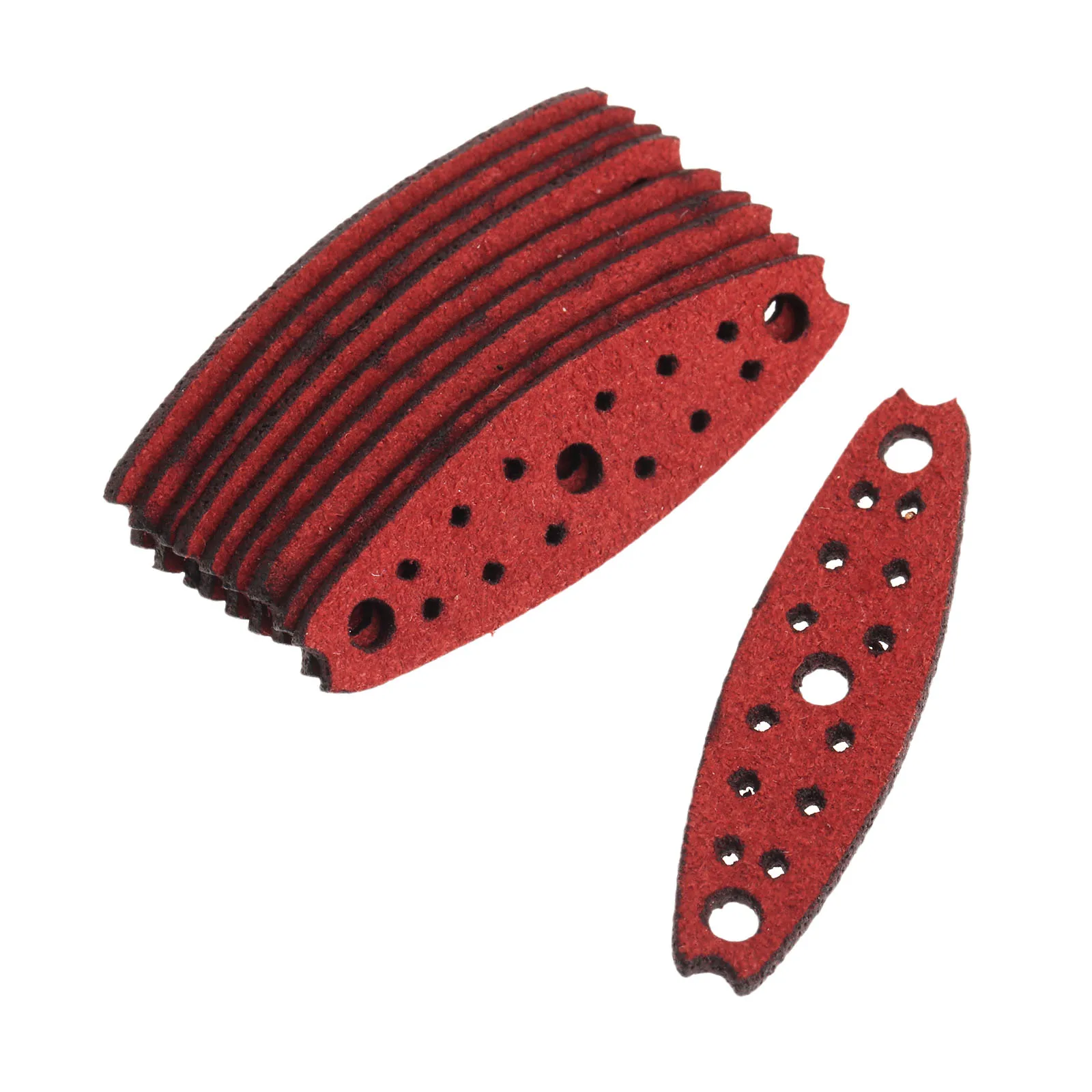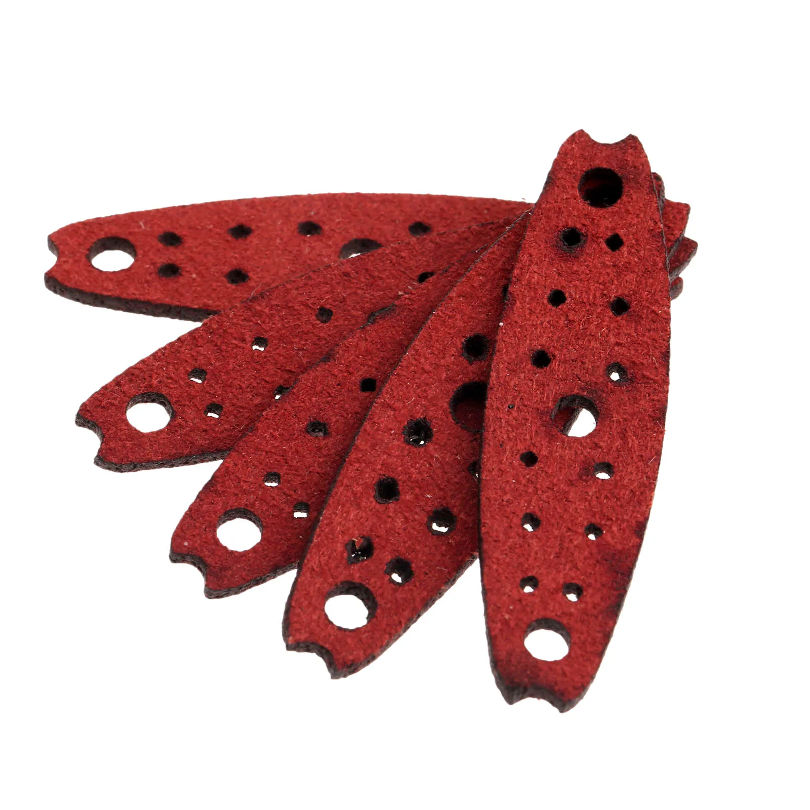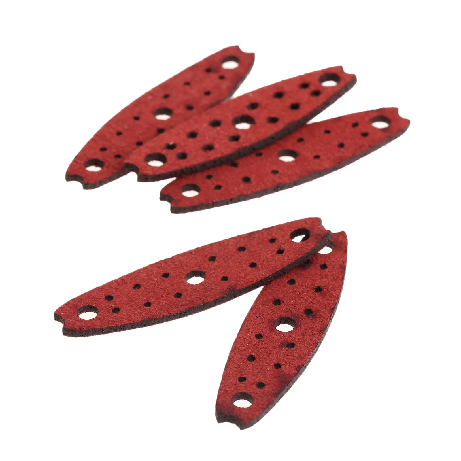Experience a perfect blend of durability, style, and precision with this set of microfiber leather slingshot pouches in striking dark red. Designed to elevate your hunting or recreational activities, these pouches feature a sleek, elongated oval shape with pointed ends for a streamlined look. Each pouch measures 5.0 cm in length and 1.8 cm in width, with a central hole for secure attachment to your slingshot frame. The textured microfiber leather surface offers excellent grip and resilience, ensuring reliable performance during intense use. Whether you need a complete replacement set or spare pouches, this product provides natural aesthetics combined with practical craftsmanship. Enjoy enhanced control, durability, and a bold visual appeal with these expertly crafted slingshot pouches.