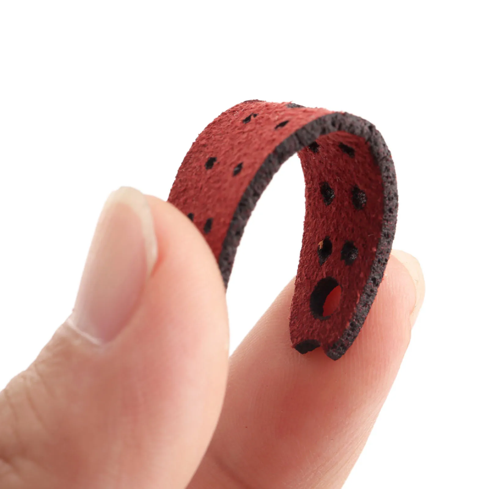 - Technical specifications include: microfiber leather material, 5.0 cm length, 1.8 cm width, dark red color, with detailed hole placement for optimal attachment and performance.