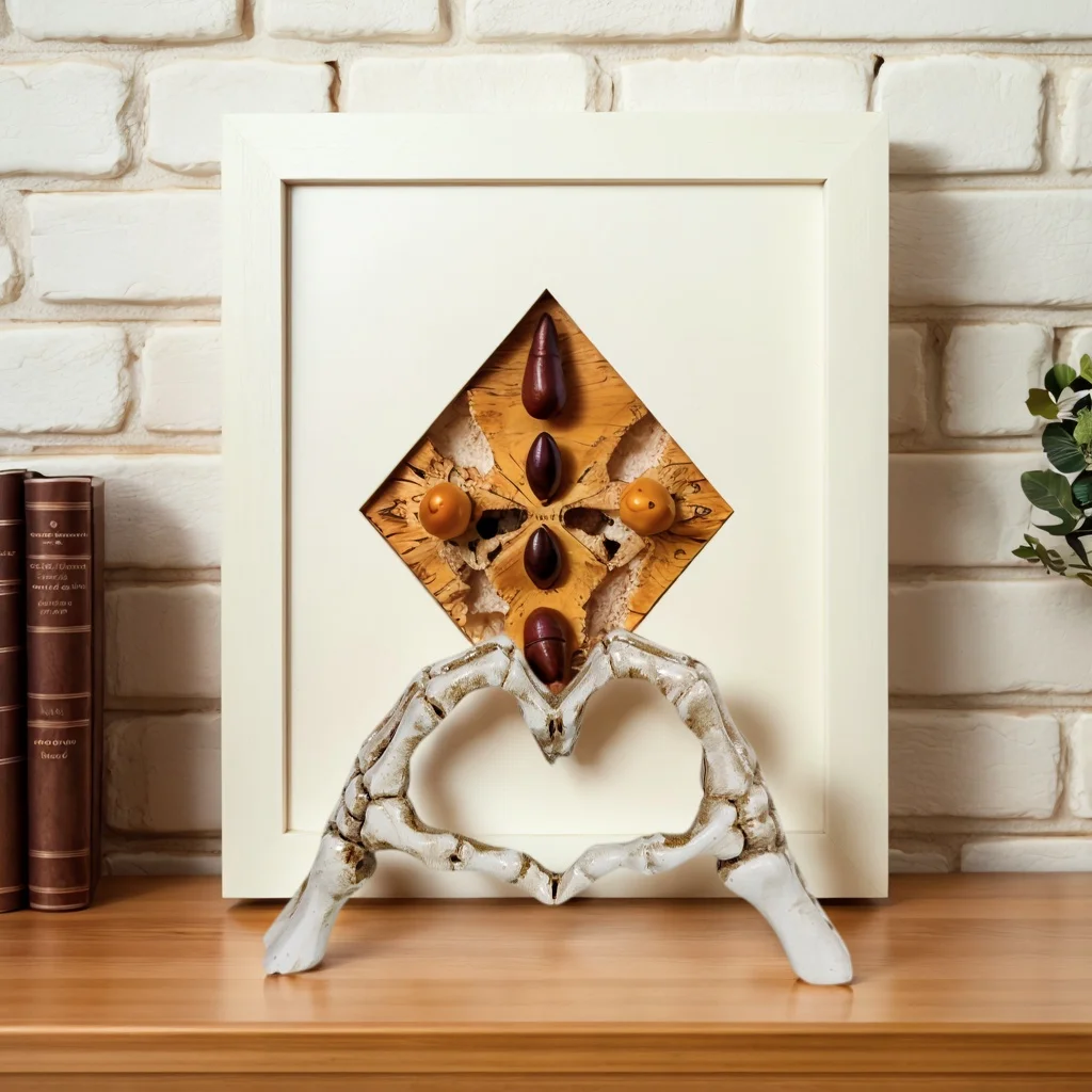 Immerse yourself in the captivating allure of this dark-style skeleton hand heart statue ornament. Crafted from high-quality resin, it boasts a weathered white finish with dark accents that emphasize its gothic, vintage appeal. The intricate skeleton hand is positioned to support a rustic, textured diamond-shaped wooden plaque, featuring visible cracks and natural wood grain that enhance its artistic, rugged charm. Attached to the hand are glossy, rounded decorative objects in deep purple and mustard yellow, arranged in a symmetrical pattern that adds a touch of vibrant contrast. Set against a simple white backdrop, this piece creates a moody yet sophisticated visual vibe. Perfect for enhancing any space with a gothic touch or spooky Halloween flair, it’s a stunning conversation starter and artistic centerpiece.