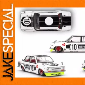 Bring the thrill of vintage racing to your collection with this detailed 1:64 scale diecast Datsun 510 model by TSM MODEL. Crafted from metal, this non-electric replica features a sleek white body accented by bold black racing stripes, with realistic side mirrors, round headlights, and vibrant decals like yellow-green “ADVAN” branding and the racing number “10.” The model boasts a striking red wheel design with black tires and a darker multi-spoke wheel option, capturing an authentic sporty vibe. Perfect for enthusiasts aged 14 and above, this meticulously crafted collectible embodies speed, style, and craftsmanship, adding dynamic flair to your display.