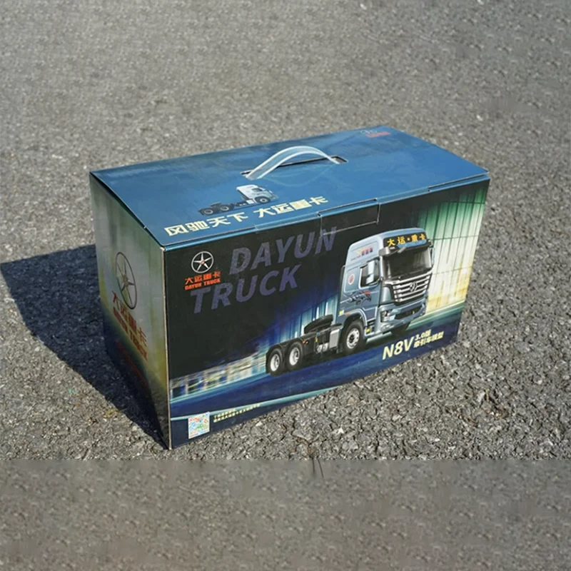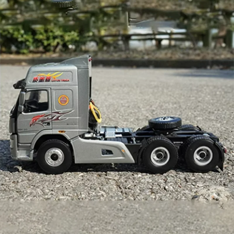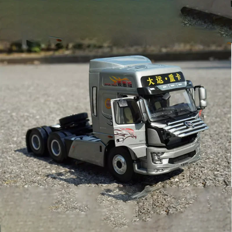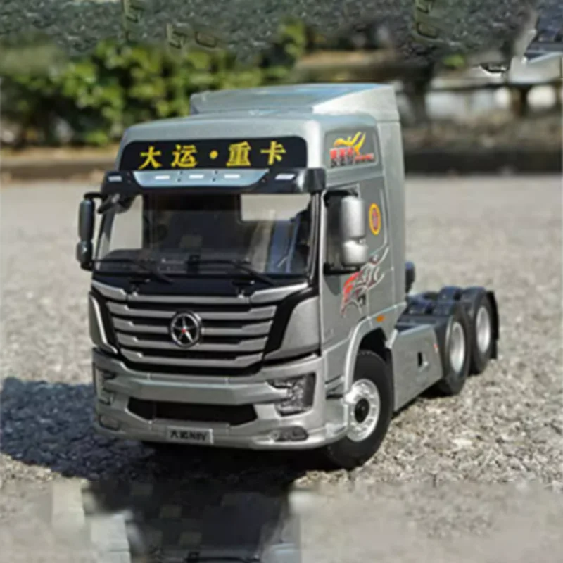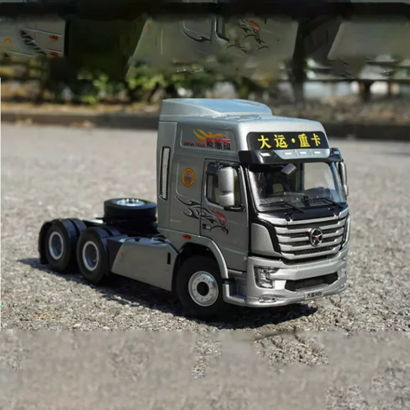 Experience the realism and craftsmanship of this meticulously crafted diecast model of the Dayun N8V tractor. Measuring approximately 30 centimeters in length, 11 centimeters in width, and 15 centimeters in height, this 1:24 scale replica features an alloy body with a sleek metallic gray finish accented by black details. Its surfaces are smooth and refined, with subtle panel lines that enhance authenticity. The front showcases a modern, aerodynamic cab with a prominent grille featuring horizontal slats and the Dayun logo, while the detailed headlights with clear lenses add to its lifelike appearance. Decorated with flame-like decals and Chinese characters, the model exudes dynamic visual interest. The black rubber tires with silver rims give it a realistic stance, completing an impressive display piece perfect for collectors or enthusiasts.
