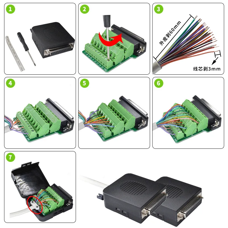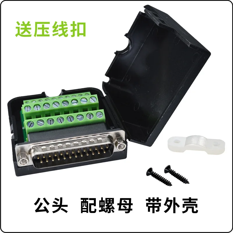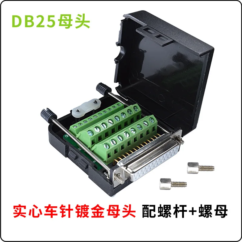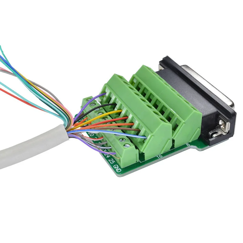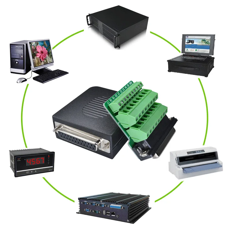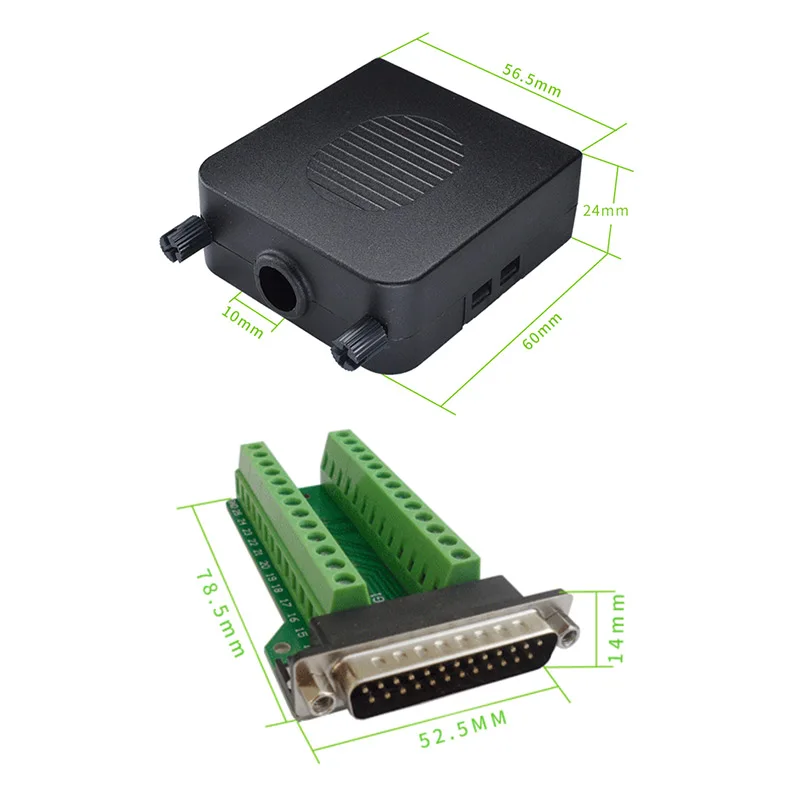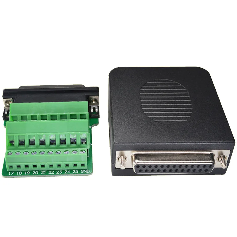 This is a compact and modern-minded adapter plate designed with a durable black plastic rectangular housing featuring a smooth matte finish. It showcases a high-quality gold-plated DB25 connector with a polished metallic shine, securely attached with two screws for stable connection. Adjacent to the connector is a bright green terminal block with multiple screw terminals for easy, solder-free wiring. The terminal block’s vivid green color highlights its accessibility and functionality, complemented by silver screw terminals labeled for precise pin identification. The design emphasizes industrial efficiency, offering a clean, organized interface for parallel port connections without welding. Its aesthetic combines technical neatness with functional clarity, ideal for professional and hobbyist applications requiring secure data transfer.