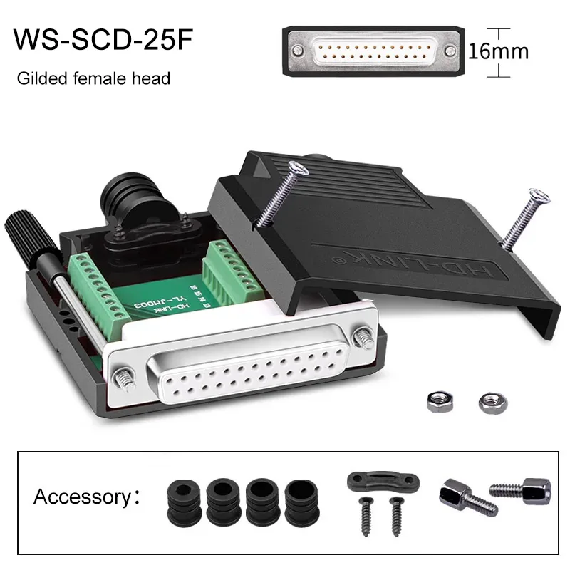 This sleek DB25 breakout connector features a black plastic housing with a precise rectangular form, offering a professional industrial look. It incorporates a metallic DB25 female socket with visible metal contacts arranged in a uniform horizontal line, ensuring excellent signal integrity. The assembly includes a vibrant green printed circuit board (PCB) nestled within the enclosure, complemented by matching green terminal blocks with expertly aligned screw terminals for solderless wiring. Additional components include small black screws for secure mounting, rubber grommets for insulation, and a tiny probe-like element with a metal tip for grounding or testing. Its durable ABS plastic combined with copper contacts guarantees optimal signal transmission, making it ideal for serial communication projects and electronic integrations. The device emphasizes functionality, reliability, and ease of wiring.