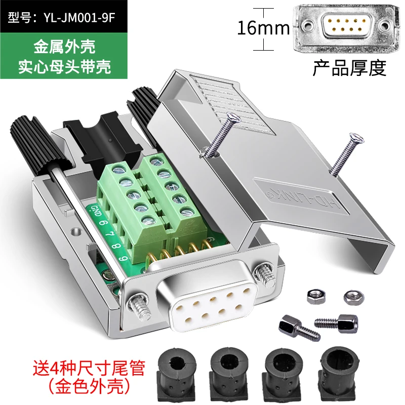 Experience reliable serial communication with this expertly designed DB9 solderless connector. Its robust black plastic housing ensures durability and a professional appearance, while the removable cover with embossed “TOOLS” detail highlights its practical functionality. The connector features a classic metallic DB9 port with gold-plated pins, guaranteeing secure and corrosion-resistant connections. Inside, vibrant green terminal blocks provide easy, solderless wiring in two precise rows, making installation straightforward and efficient. Two sizable black rotary knobs facilitate secure adjustments or cable management, and four rubber sealing caps offer protection against dust and moisture when ports are unused. Whether for RS232 or RS485 applications, this connector combines high-quality craftsmanship with user-friendly features, ensuring dependable performance for your communication setups.