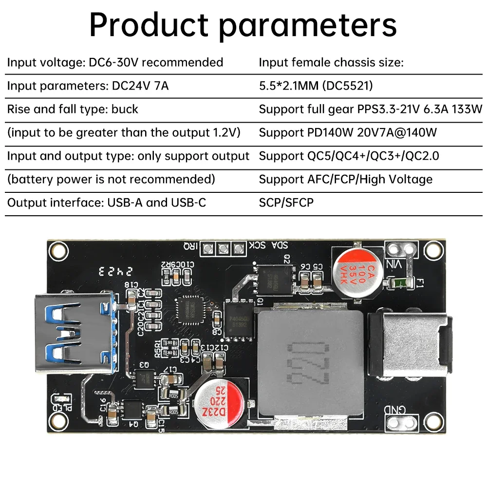 Experience powerful, efficient charging with this advanced DC 6-30V 140W multi-protocol desktop module. Designed for seamless compatibility with high-power devices like laptops and smartphones, it offers fast charging through protocols such as QC4.0+, PD3.0, PPS, and more. The black, rectangular casing provides a modern, professional aesthetic, accented by shiny metallic USB ports and a large thermal dissipation block for effective heat management. With its compact size and organized surface-mount components, including a white cylindrical capacitor with bold red markings, it combines functional precision with industrial style. This module transforms your power setup, delivering reliable, rapid power transfer, while safeguarding your devices with multiple protection features.