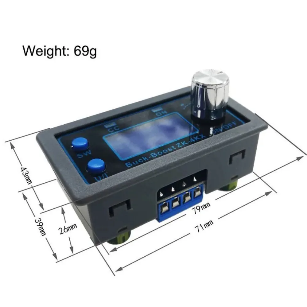 Experience precise voltage regulation with this sleek, compact DC-DC buck-boost converter. Its clean rectangular design, measuring 79mm x 43mm x 26mm, combines functionality with modern aesthetics. The bright blue LCD screen vividly displays real-time input/output voltage, current, power, capacity, and operation time, making monitoring effortless. Two round tactile buttons on the left allow easy mode switching and parameter adjustments, while a textured rotary encoder knob on the right offers smooth, accurate control over voltage and current settings. LED indicators provide clear visual signals for operational modes. Perfect for lab use or DIY projects, this module's professional appearance complements any setup. Invest now to elevate your power management system with its reliable, user-friendly interface.
