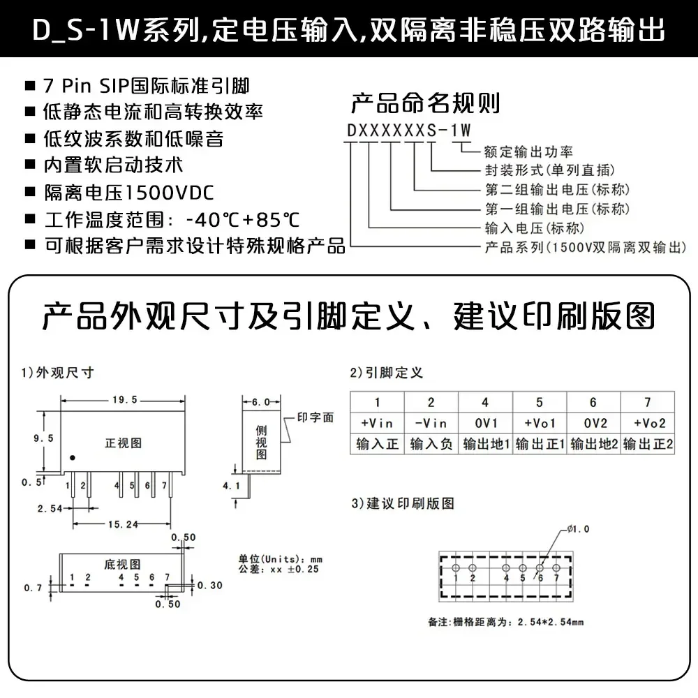 Enhance your electronic projects with this series of DC-DC dual isolation modules, including models D120303S-1W, D120505S-1W, D120909S-1W, D121212S-1W, D121515S-1W, and D122424S-1W. These sleek, black rectangular modules feature a modern minimalist design with white alphanumeric labels for easy identification and neatly aligned metal pins for secure soldering. Built as high-quality voltage regulators with dual isolation features, they ensure electrical safety and stable voltage output for various applications. Perfect for professionals needing reliable, durable components in compact form, these modules are a practical choice to streamline your circuit design and enhance performance.