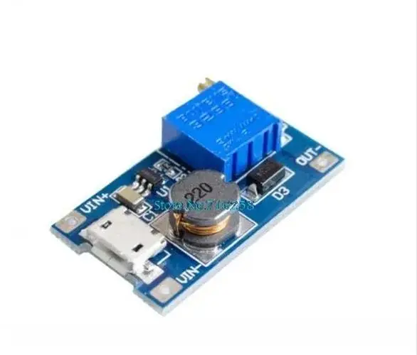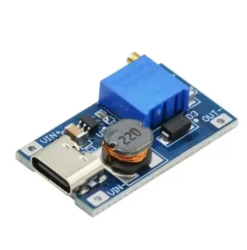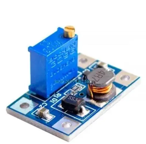 Enhance your electronic projects with this set of five compact DC-DC step-up power modules, each measuring 36mm x 17mm x 14mm. Designed to provide a maximum output current of 2A and an output voltage adjustable up to 28V from an input of 2V to 24V, these modules boast a high efficiency of up to 93%. Featuring a potentiometer for precise voltage calibration—requiring at least 20 counterclockwise turns—they ensure the output surpasses the input voltage. With robust components including inductors marked “220,” surface-mounted resistors and capacitors, and metallic connectors, these modules combine functional reliability with a sleek, modern aesthetic, perfect for voltage regulation in various electronic applications.