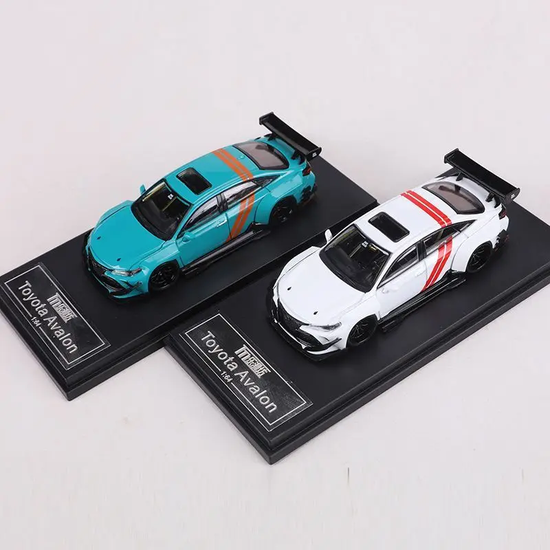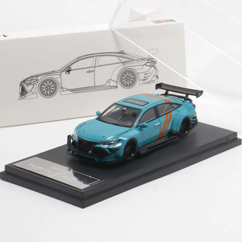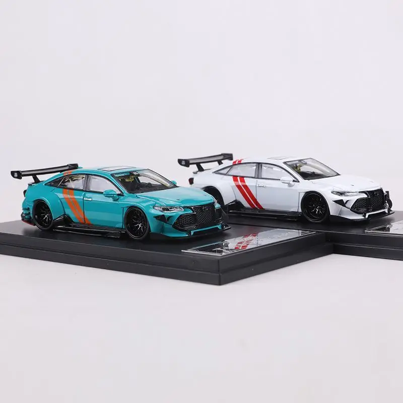 This 1:64 scale diecast model car is an exquisite representation of the Toyota Avalon, crafted from durable alloy and plastic, measuring approximately 7 cm in length. The vibrant design features two color options: a striking turquoise blue with orange racing stripes and a sleek white with red racing stripes, both showcasing detailed front grilles and sporty rear wings. The models include realistic headlights and taillights, clear windows for visibility of intricately designed interiors, and black multi-spoke wheels to enhance the racing theme. Ideal for collectors, this model car is a perfect addition to any display or enthusiast’s collection.