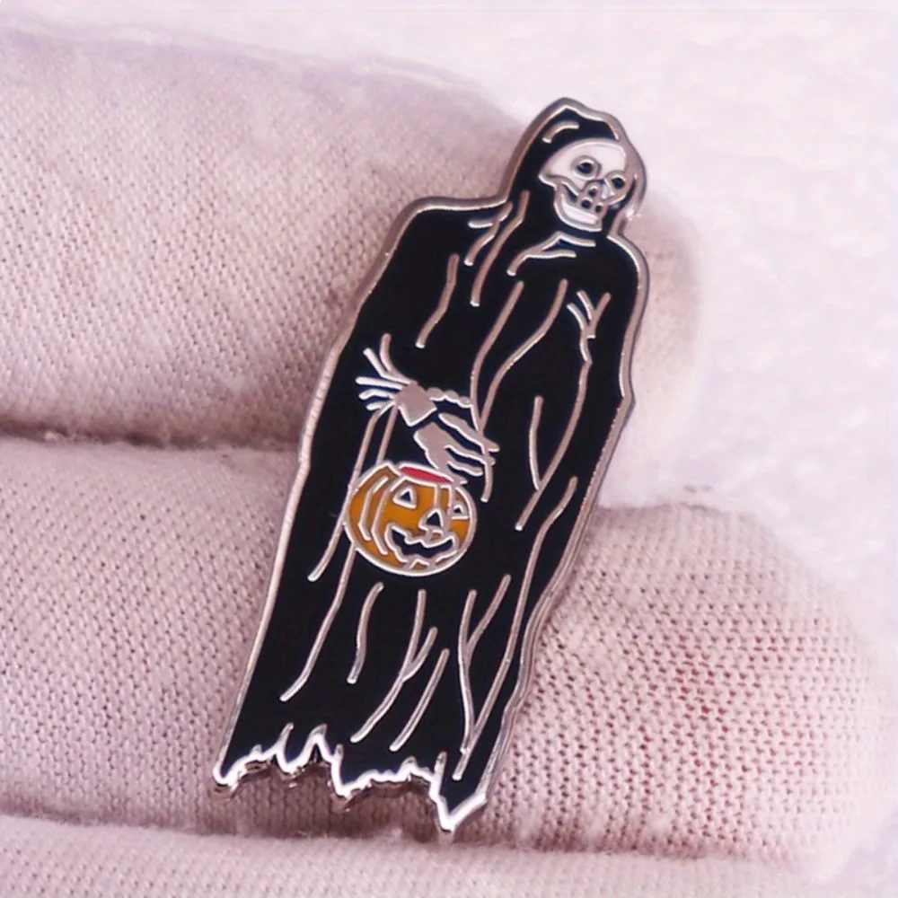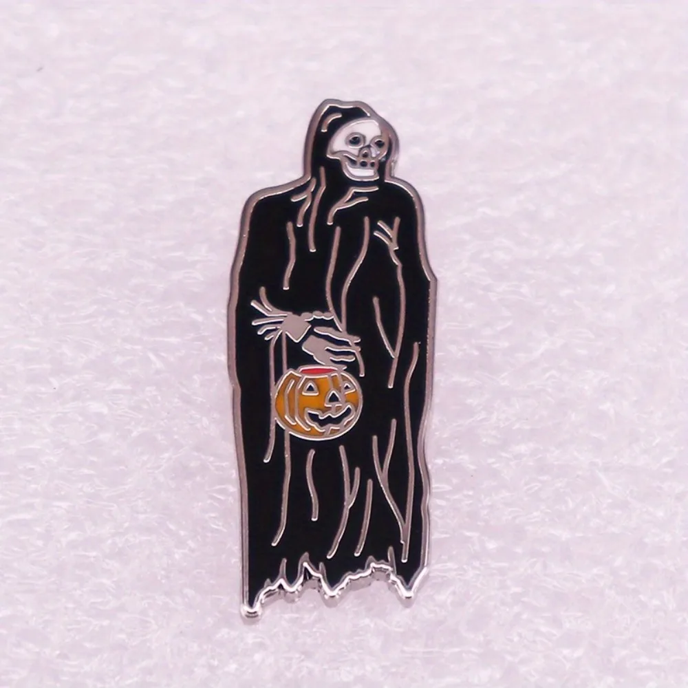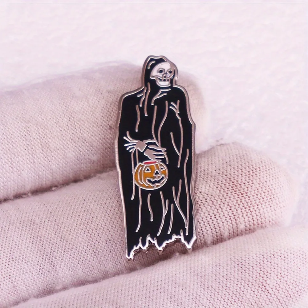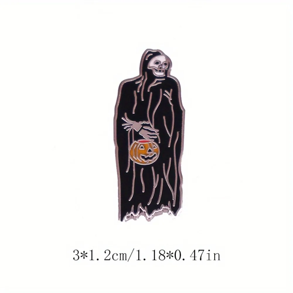 This uniquely designed Death and Pumpkin Lantern Brooch presents an enchanting blend of eerie aesthetics and playful charm. Crafted from durable copper, it features a prominent grim reaper in a flowing black robe, evoking a retro and festive style ideal for Halloween. The intricate details of the skeletal face and bony hands enhance its spooky allure, while the vibrant orange pumpkin lantern adds a whimsical touch. Perfect for personalizing jackets, hats, bags, or DIY clothing, this compact brooch is a must-have accessory for anyone wanting to showcase their love for the Halloween spirit. Its unisex design makes it suitable for everyone.