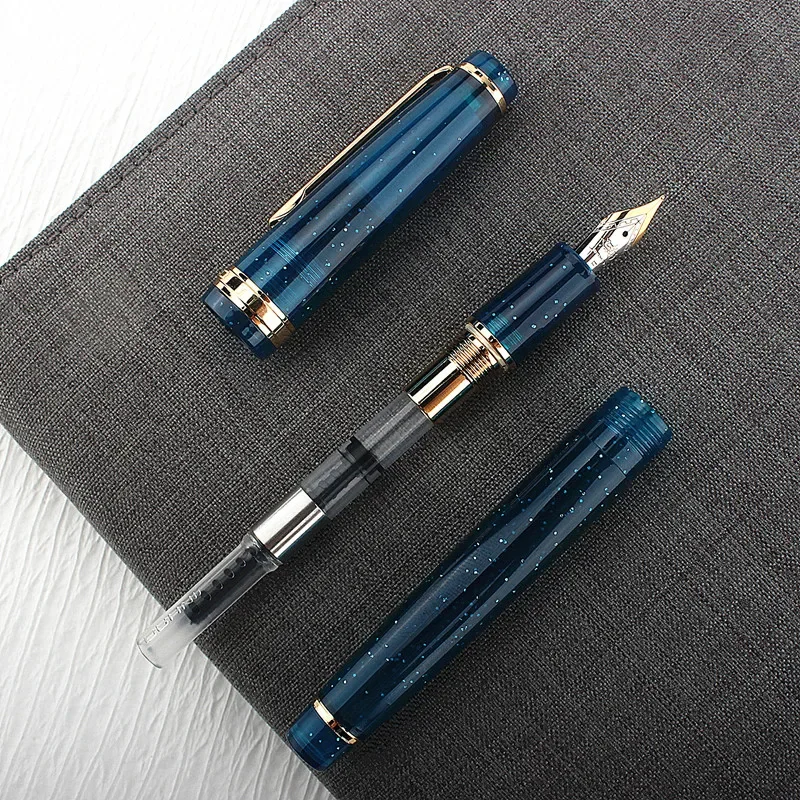 Experience the elegance of this Jinhao 82 Series Fountain Pen, crafted with a glossy deep blue acrylic body that embodies modern sophistication. Its starry, cosmic specks make each pen unique, adding a touch of luxury to your writing routine. Designed for comfort and style, this pen measures 123mm in length and 14mm in diameter, with a balanced weight of 20 grams, ensuring effortless writing. The gold-colored clip and metallic band on the cap elevate its appearance, making it suitable for professional settings or personal use. The rotating cap mechanism provides convenience and security during use. Whether you're taking notes, drafting ideas, or signing documents, this pen combines functionality with a refined aesthetic.