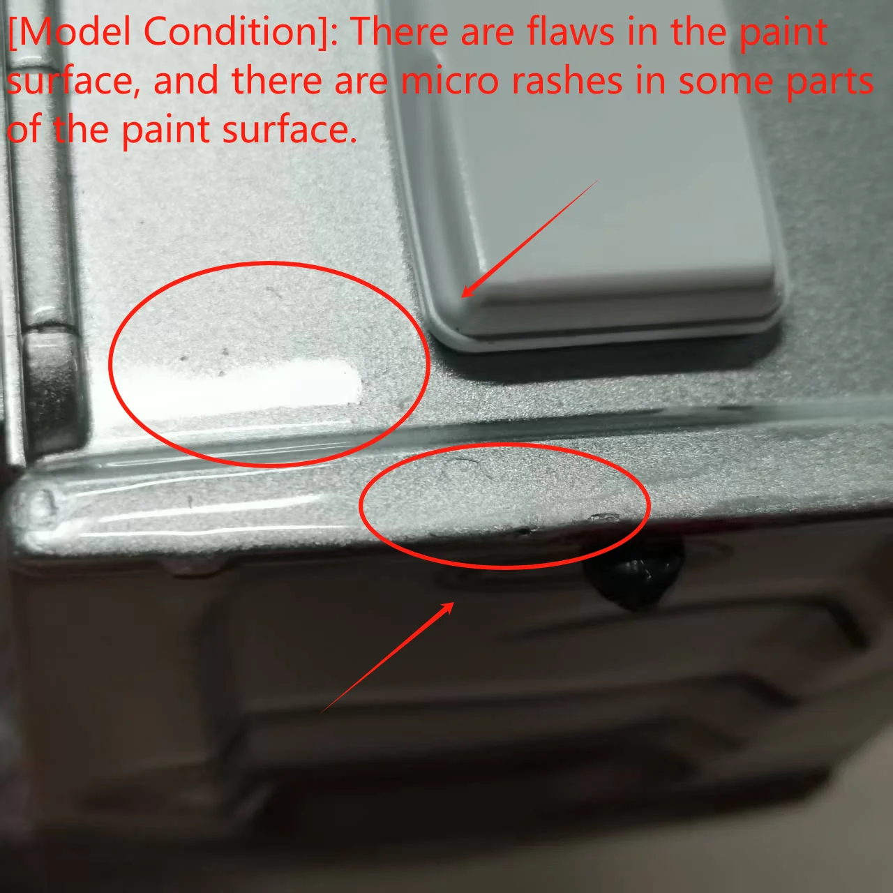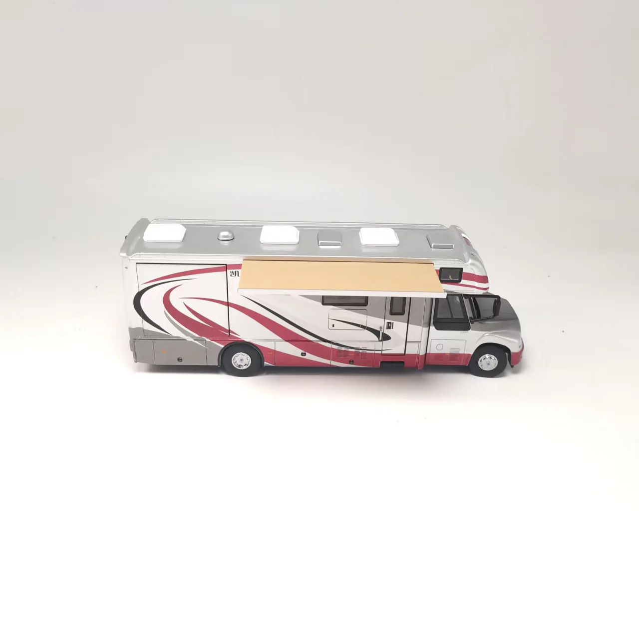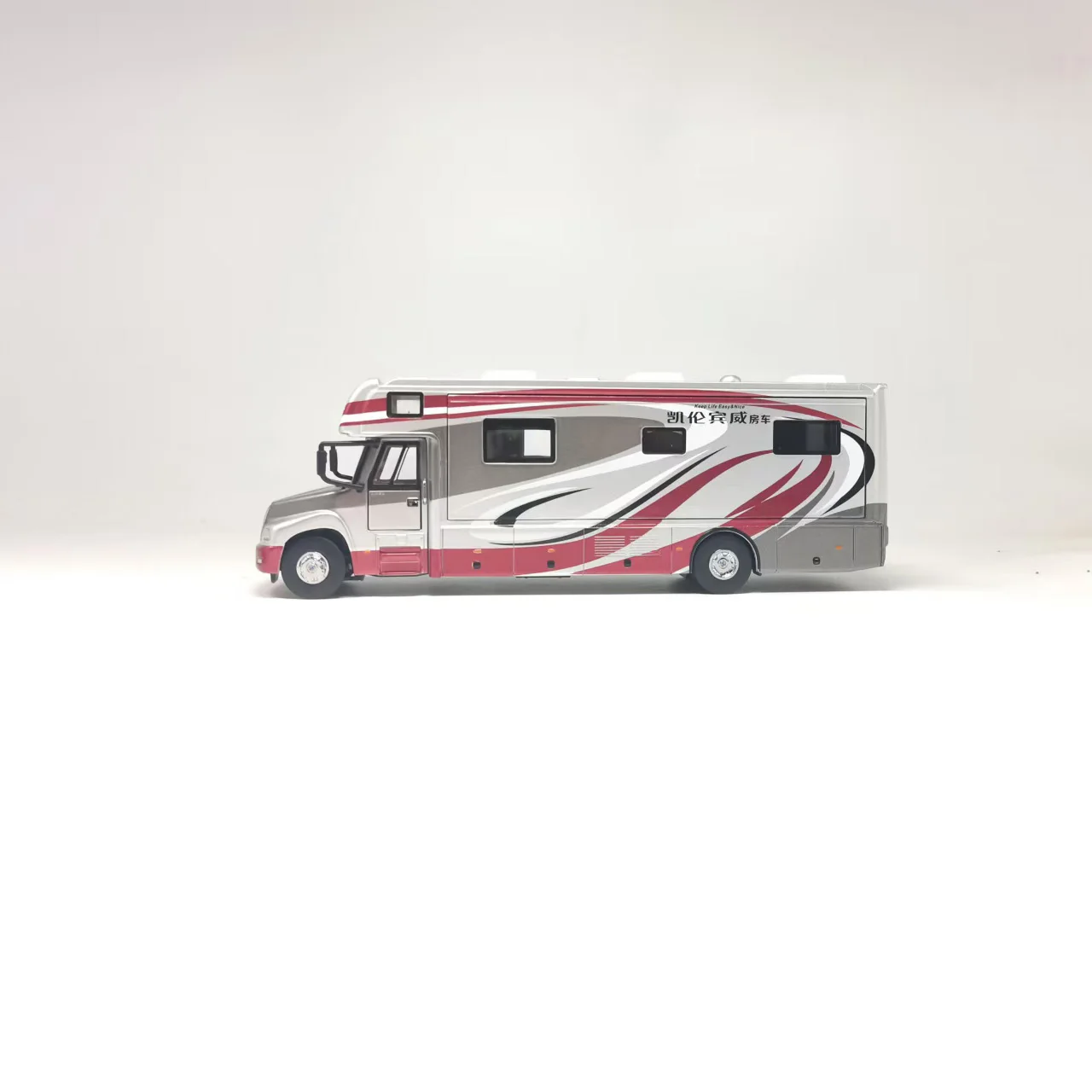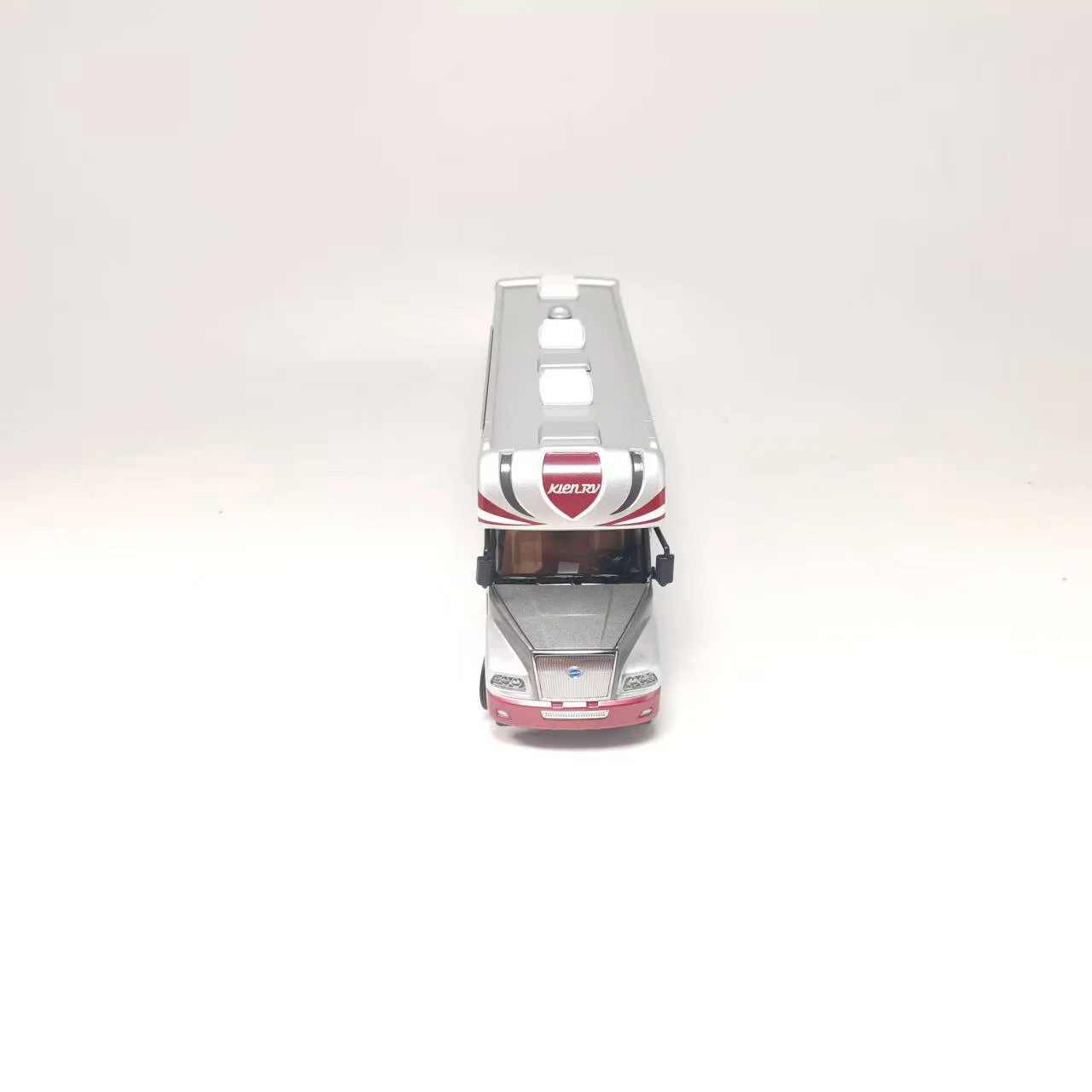 This defective 1:42 scale die-cast model of a Yutong ZK5180 RV features a realistic alloy construction with detailed design elements, including a silver body accented by black, red, and bluish highlights, smooth curved lines, and realistic front grille and headlights. Made from alloy, plastic, and rubber, it measures approximately 1:42 in scale, perfect for static display, collection, or gifting. Minor paint flaws and micro rashes are present, emphasizing its handcrafted look as a collectible or decorative item for enthusiasts aged 14 and above. Packaged in a color box, this model captures the sleek, modern aesthetic of luxury recreational vehicles.