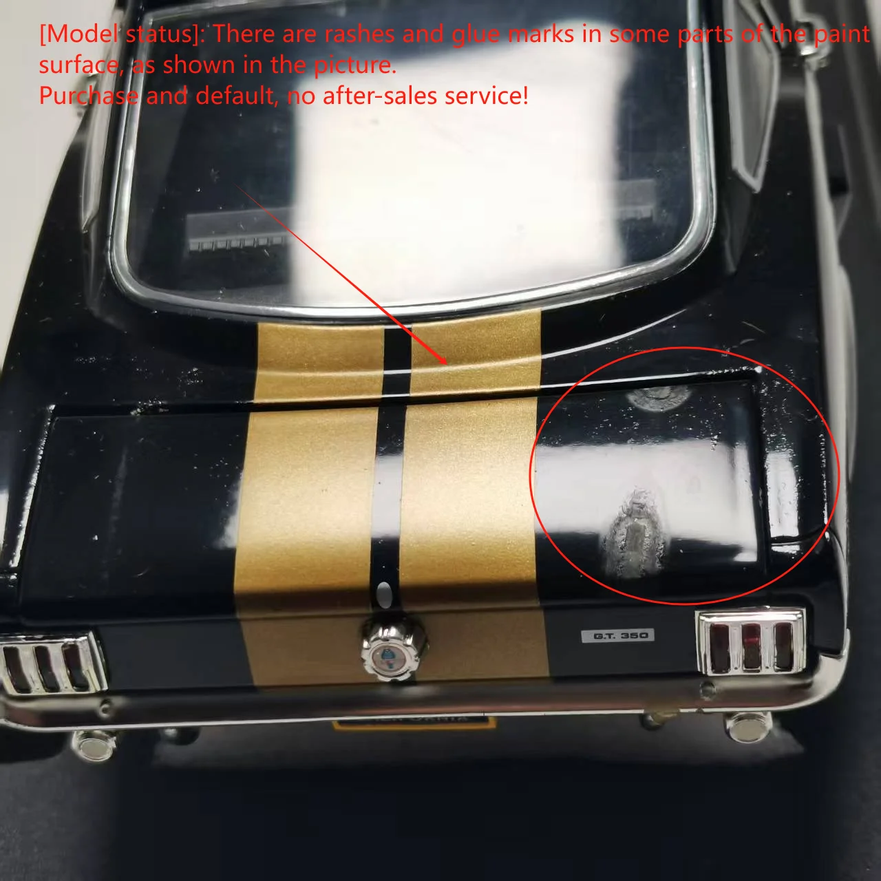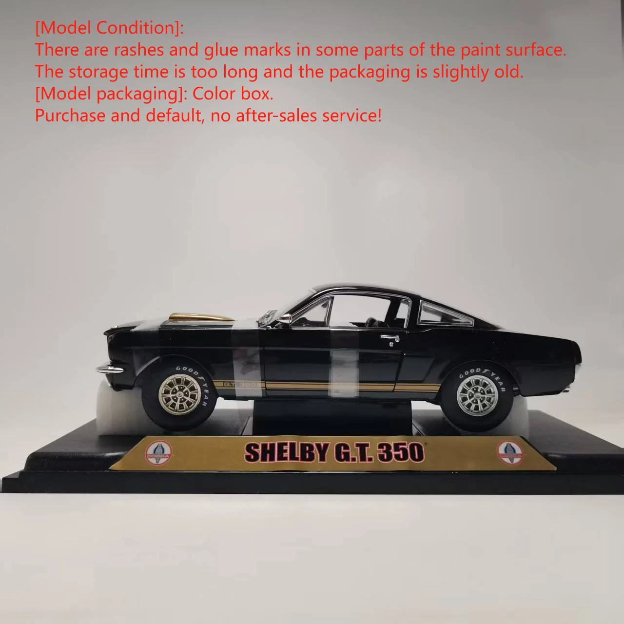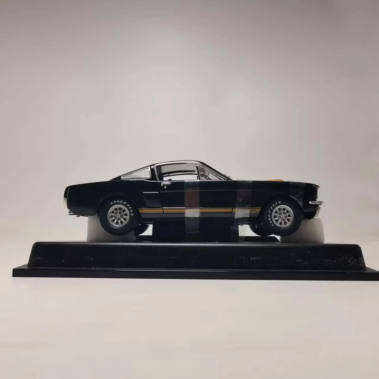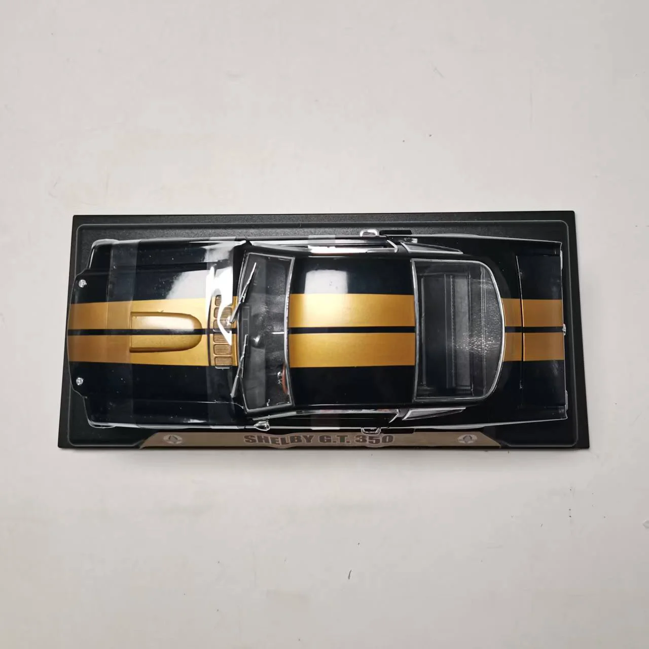 Imagine adding this striking Shelby GT350 1:18 scale die-cast model to your collection, showcasing a sleek, vintage sports car with a glossy black finish. Its elegant thin gold stripe along the sides enhances its sophisticated appeal. The detailed alloy body features realistic elements such as a prominent front grille, a hood with a subtle scoop, and functional, openable doors, making it a remarkable display piece. Clear windows reveal an intricately designed interior, perfect for automotive enthusiasts who appreciate craftsmanship. Despite minor paint flaws like rashes and glue marks, which add character, this model offers excellent visual appeal. It sits securely on a stylish black display stand, ready to be admired or gifted in its aged, color box packaging.