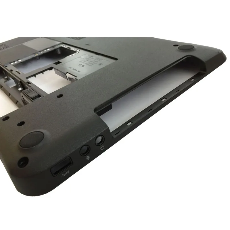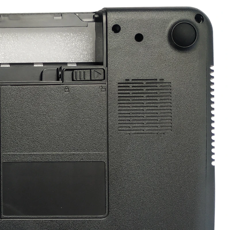This laptop bottom base cover case is designed specifically for the Dell Inspiron N5110 (15R) model, providing both durability and a sleek appearance. Primarily black in color, it is crafted from lightweight plastic that boasts a subtly textured finish for improved grip. The molded design ensures a perfect fit, with all necessary cutouts and recesses aligned perfectly for easy installation of hardware components. Featuring ventilation grilles at the edges, it promotes adequate airflow to prevent overheating, ensuring optimal performance. The absence of speaker openings makes this case an ideal choice for users prioritizing physical protection over audio components.