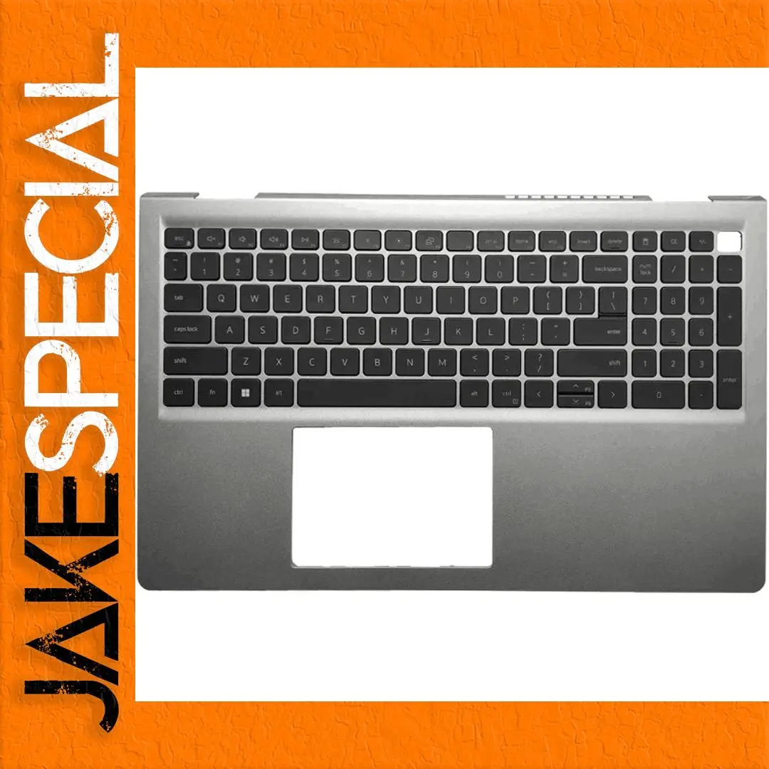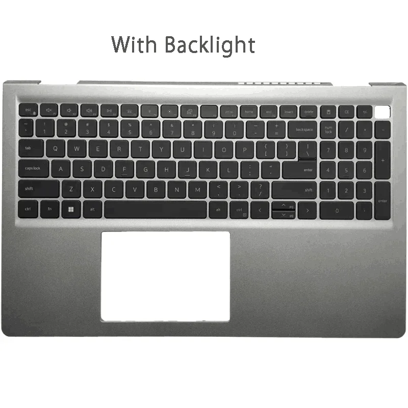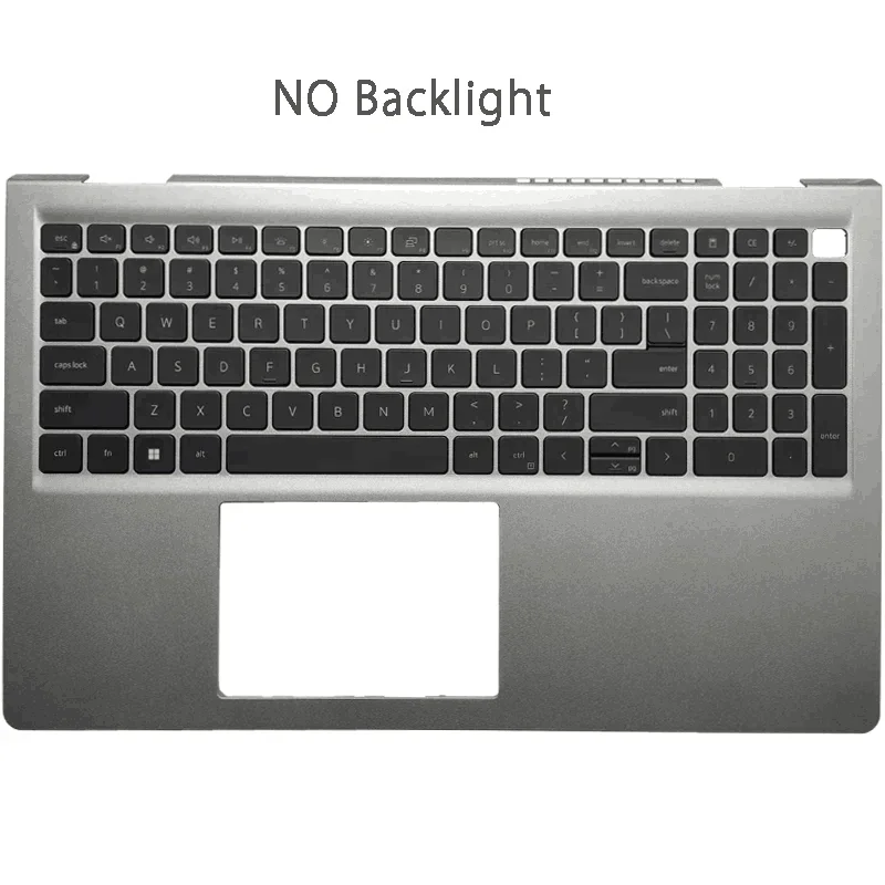 Upgrade your Dell Inspiron laptop with this stylish replacement palm rest upper cover, compatible with models 15 3510, 3511, 3515, 3520, 3521, and 3525. This product features a sleek silver color with a smooth metallic finish, integrating a full US keyboard with black keys for a striking contrast. The keyboard offers a user-friendly design with distinct key separations and clear labeling. Available in options with or without backlighting, this new item is in excellent condition, ready to enhance your device’s functionality and appearance. Model numbers include 054WVM and 0HRHC5, ensuring a perfect fit for your needs.