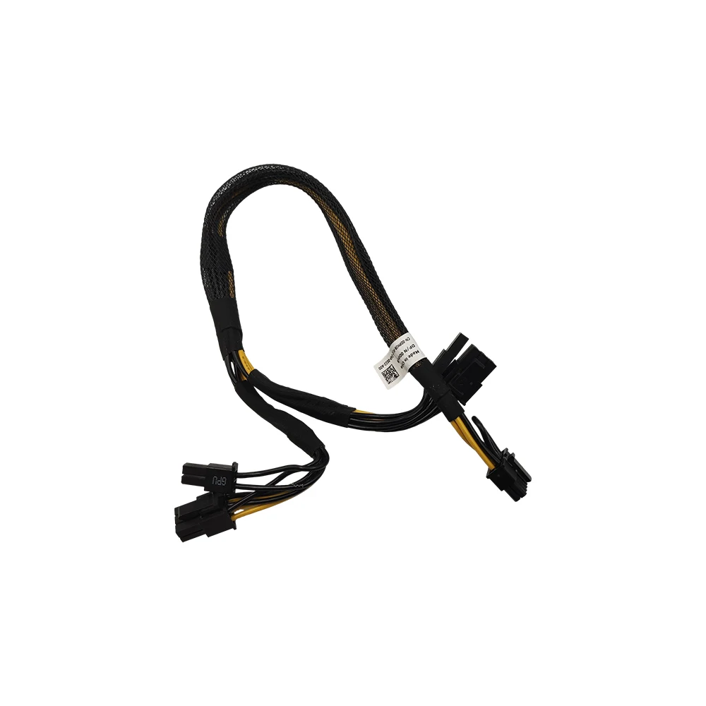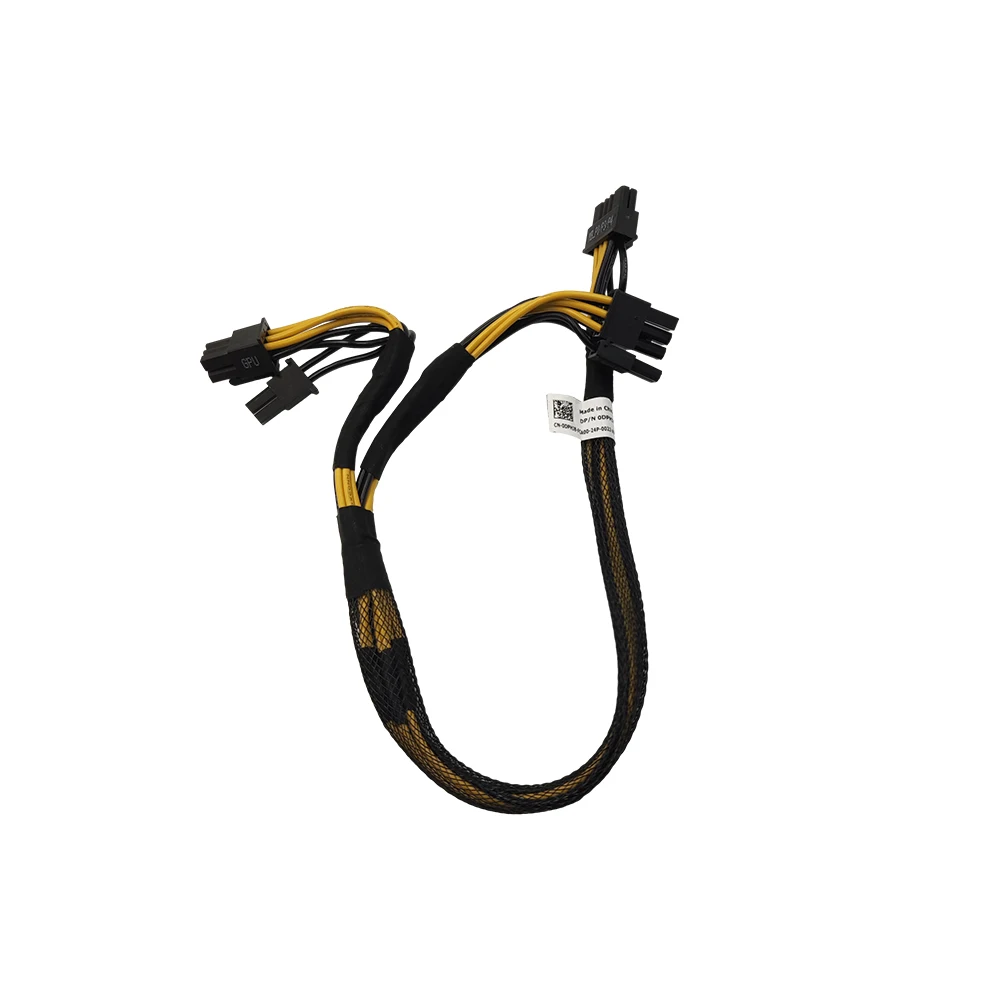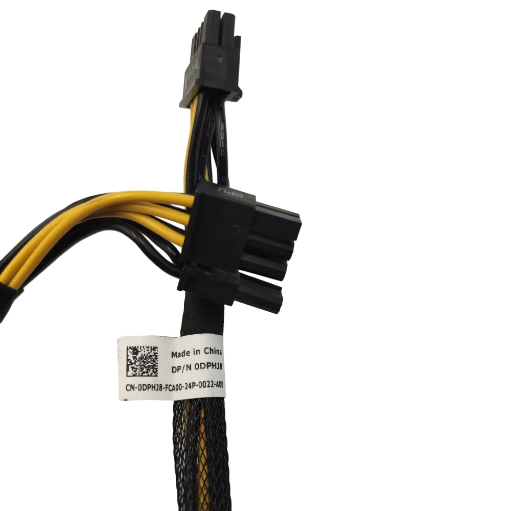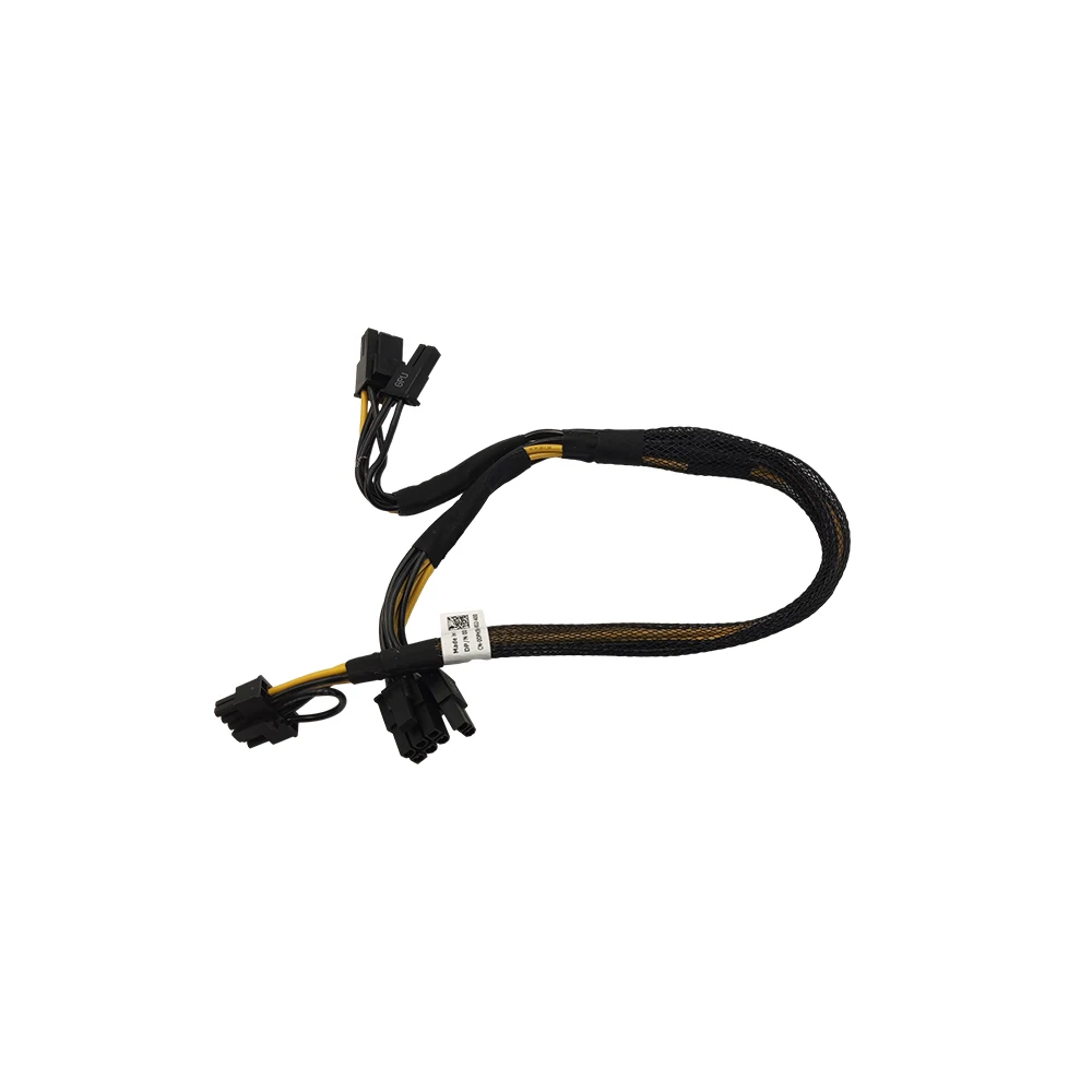 Experience seamless power delivery with this original Dell PowerEdge power cable, model 0DPHJ8. Designed specifically for Dell servers like the R7525, R750, and R750XS, this cable guarantees a reliable connection for your server and GPU needs. Its durable metal construction, coupled with a black woven protective sleeve, offers enhanced protection and a professional, industrial aesthetic. The connectors are built with precision: one featuring a solid block shape with multiple pins, and the other segmented into smaller sections with markings like “V” and “G” for clear identification. The internal wires—black, yellow, and brown—are subtly visible near the connectors, highlighting the cable's internal complexity and technical robustness. This cable is essential for maintaining optimal server performance.
