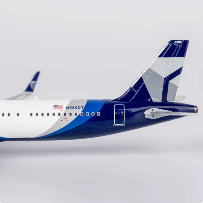 - The tail fin is painted in deep blue with elegant white and gray stylized design elements, complemented by blue winglets featuring white accents, enhancing its modern aesthetic.