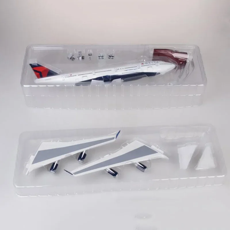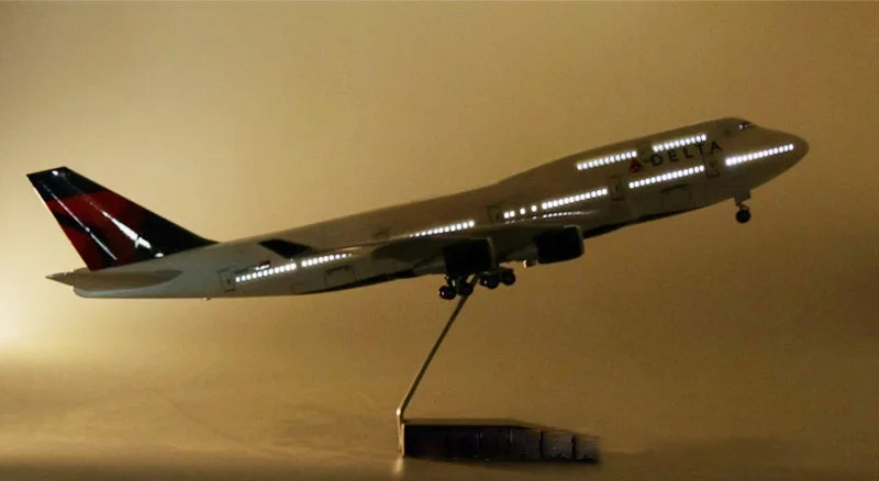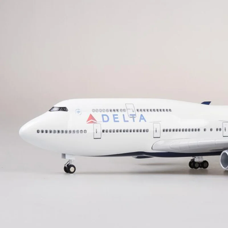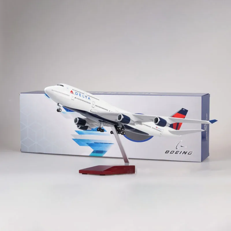 This 47cm resin scale model of a Delta Airlines B-747 aircraft at 1:150 scale offers exquisite craftsmanship and detailed realism, featuring a sleek white fuselage with jet intakes, Windows, and doors, complemented by the iconic Delta logo and tail fin with a bold red and navy blue delta symbol. Equipped with realistic landing gear and wide wings with winglets, this display piece exudes elegance. Available in versions with or without voice-activated lighting that illuminates for 20 seconds per activation, the model is fragile and suitable for adult collectors. Ideal for home or office display, it combines pristine design with functional lighting, enhancing any collection or decor.