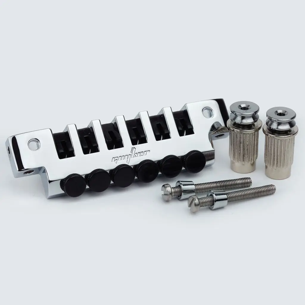 Experience the perfect blend of style and precision with this Deluxe TunePro TP-2 Tailpiece. Crafted from durable zinc alloy, it features a sleek, polished silver finish that reflects a modern, high-quality aesthetic. The rectangular design is complemented by four durable black saddles with adjustable height screws, allowing you to fine-tune your string action effortlessly. Two shiny silver adjustment knobs with ribbed sides ensure precise control over tuning settings. This professional bridge component is compatible with various guitar models, offering stability and reliability in your sound. Its robust construction and thoughtful design make it an ideal choice for upgrading or replacing your current tailpiece, giving your instrument a fresh, stylish look and improved performance.