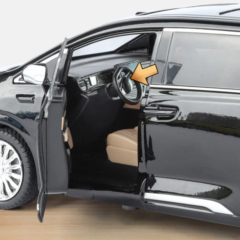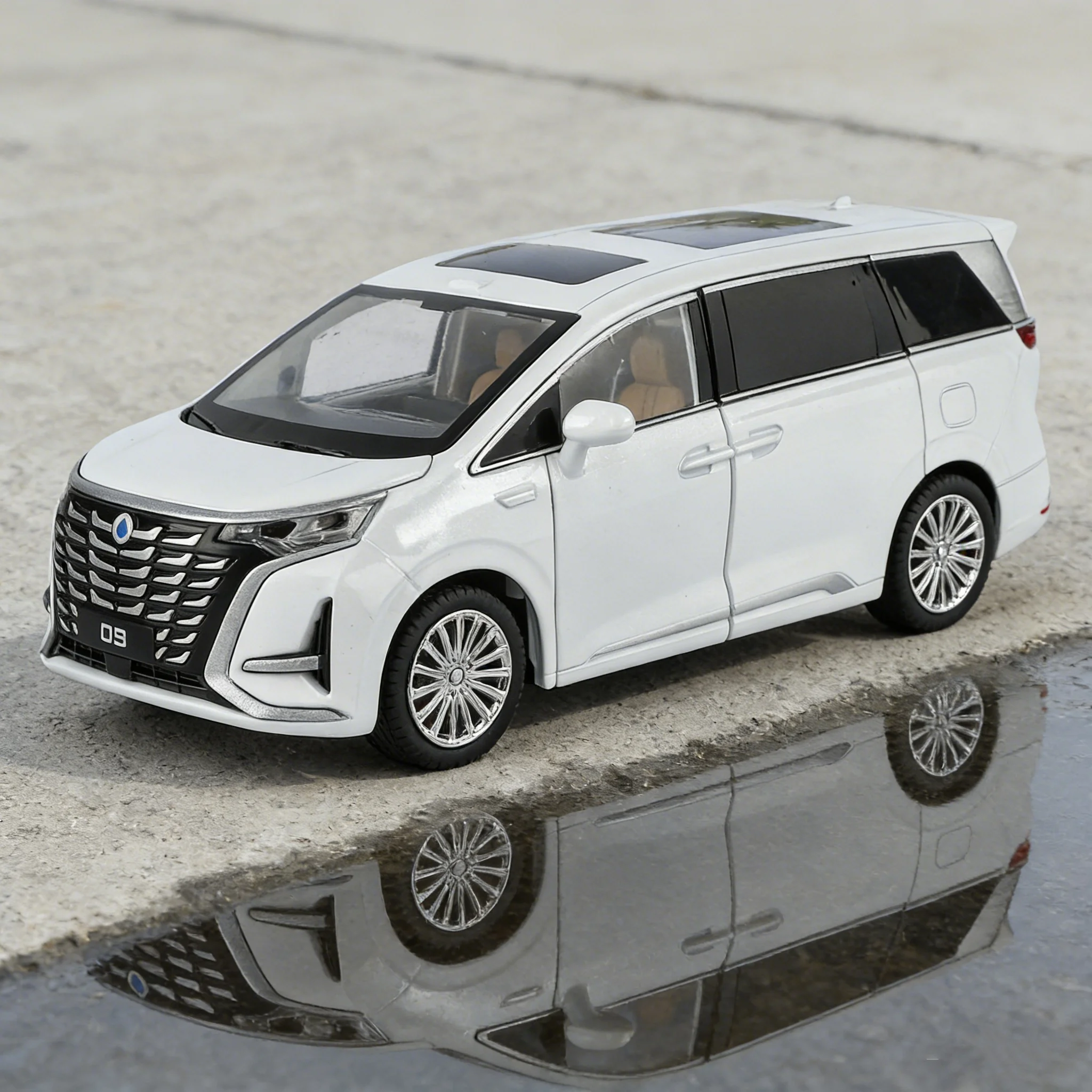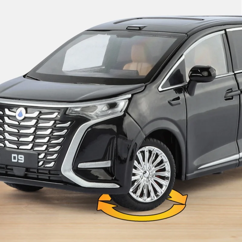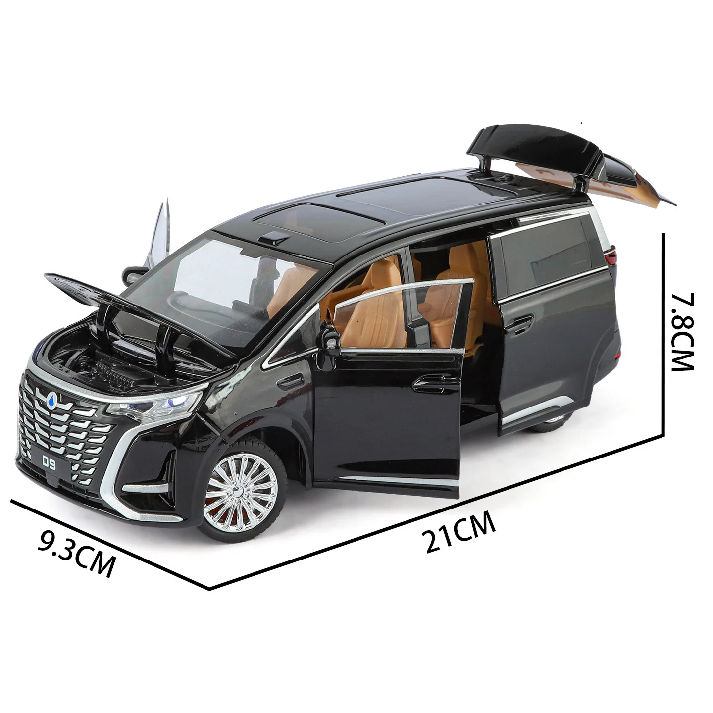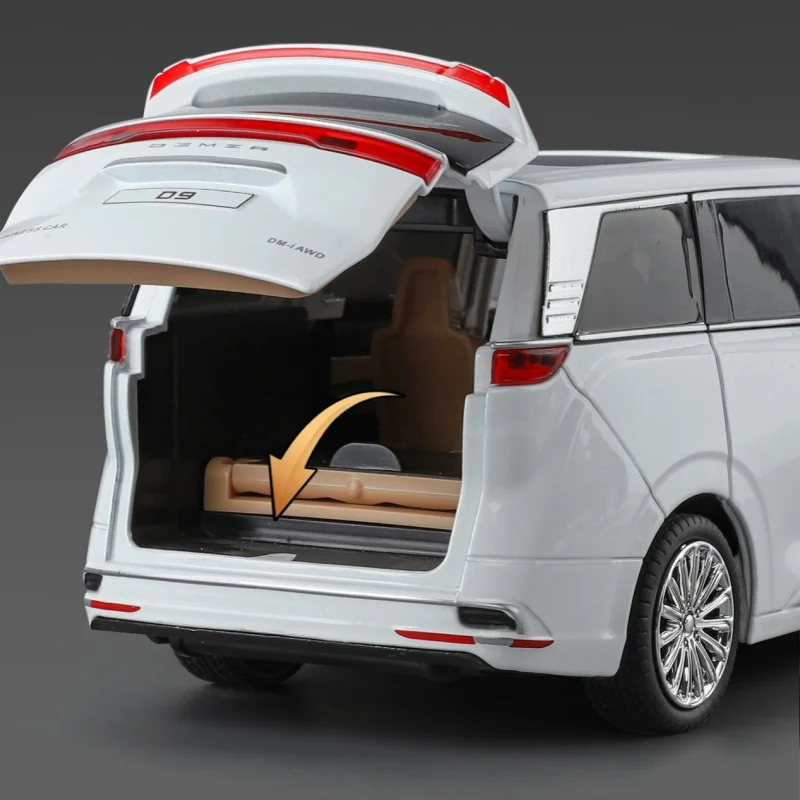 Experience the sleek elegance of the Denza D9 MPV with this detailed 1:24 scale diecast alloy model. Crafted from alloy and plastic, this collectible features a modern white or black finish, with intricately designed multi-spoke alloy wheels, textured layered grille with a central emblem, sharply shaped headlights, aerodynamic contours, tinted windows, and a panoramic glass roof for added realism. Measuring approximately 1:24 in scale, it offers a highly accurate representation of the actual vehicle, making it perfect for display and collection. Suitable for ages 4 and up, this non-electric model combines fine craftsmanship with durable materials, ideal for enthusiasts and collectors alike.