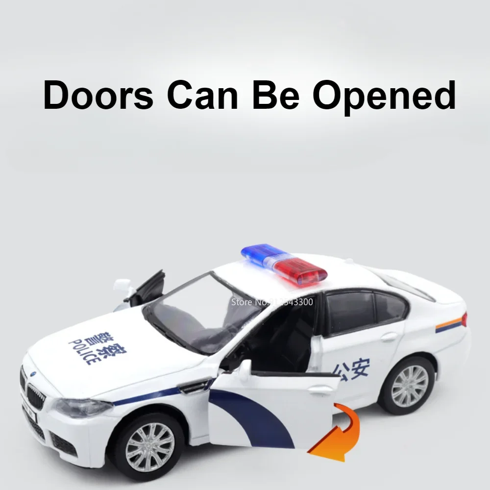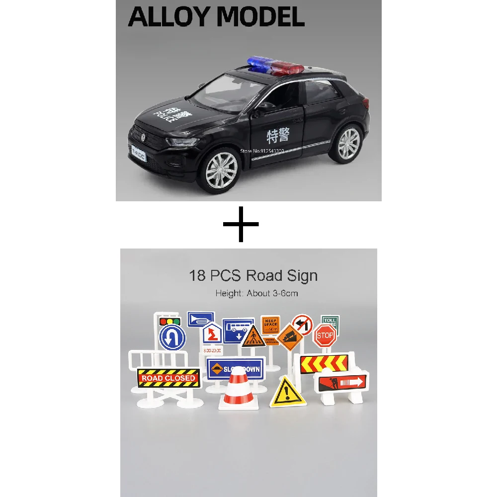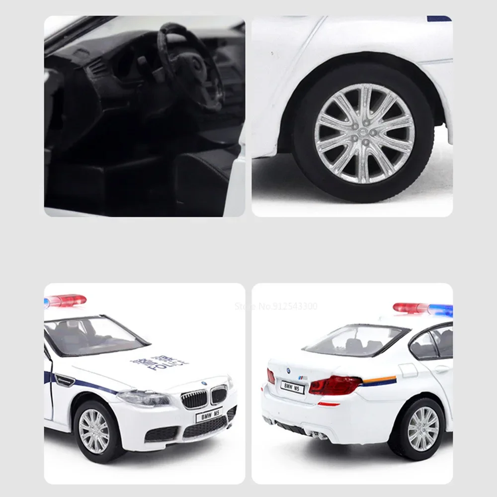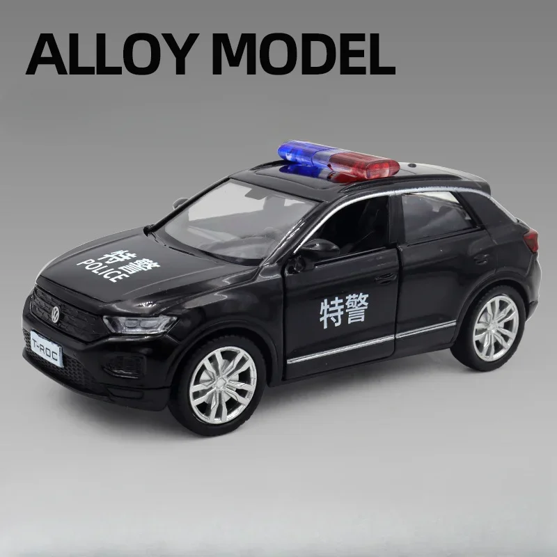 Elevate your collection with this highly detailed 1:36 scale diecast police car model, measuring approximately 12.5 cm in length, 4.8 cm in width, and 3.9 cm in height. Crafted with a durable metal body and plastic chassis, it features a sleek black and white finish, a roof-mounted police light bar with red and blue lights, and intricately detailed alloy-like wheels. The model boasts a pull-back propulsion system, openable doors, and realistic design elements, making it perfect for display or play. Certified with a CE certificate and suitable for enthusiasts aged 14 and above, this high simulation vehicle faithfully replicates classic police cars like BMW M5, Ford Mustang, and Volkswagen T-ROC.