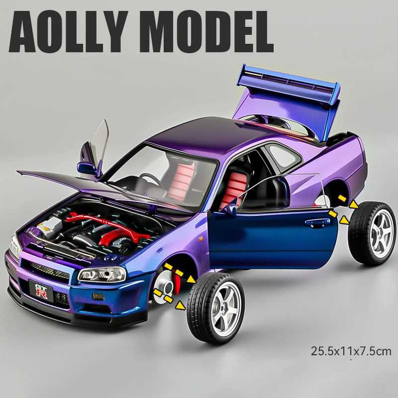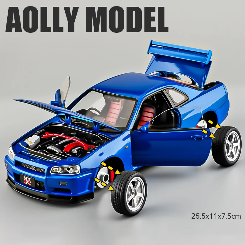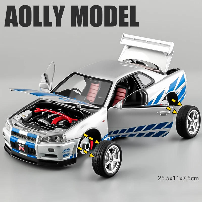 - Equipped with an aerodynamic rear spoiler, vivid tail lights, and precise exhaust detail that replicate the real GTR R34 Skyline S15's sporty look.