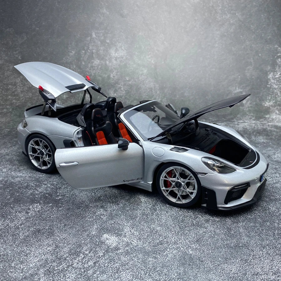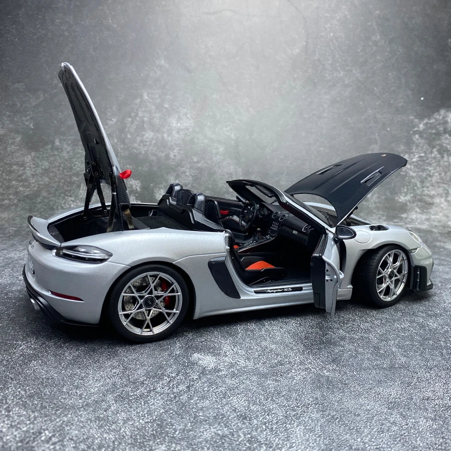Experience the thrill of the Porsche 718 Spyder RS 2023 with this highly detailed 1:18 scale die-cast model. Measuring approximately 25 cm long, 10.5 cm wide, and 7.5 cm high, this model captures the sleek, sporty silhouette of the real car. The metallic silver finish with contrasting black accents on the hood, side mirrors, and rear highlights its dynamic design. Crafted from high-quality metal, plastic, and rubber, it features functional doors, opening front and rear covers, and steerable front wheels linked to the steering wheel for realistic movement. Perfect for enthusiasts and collectors, this model adds a premium touch to any display or collection. Its intricate details make it a stunning decorative piece for any car lover.