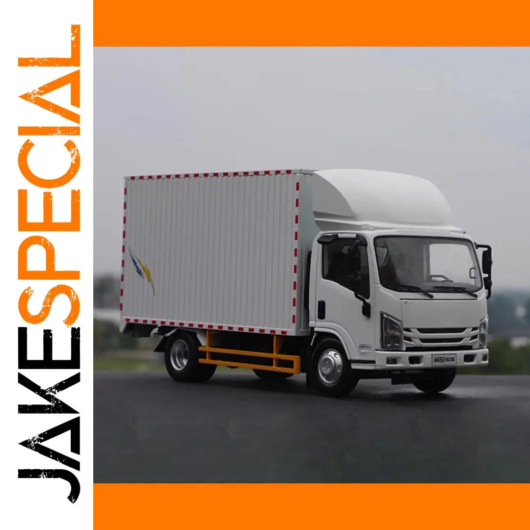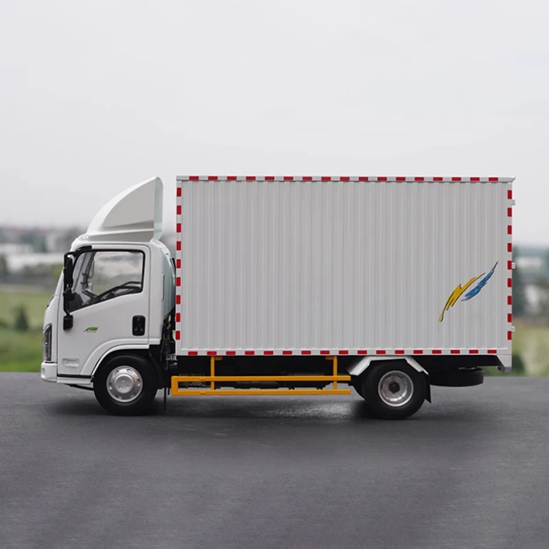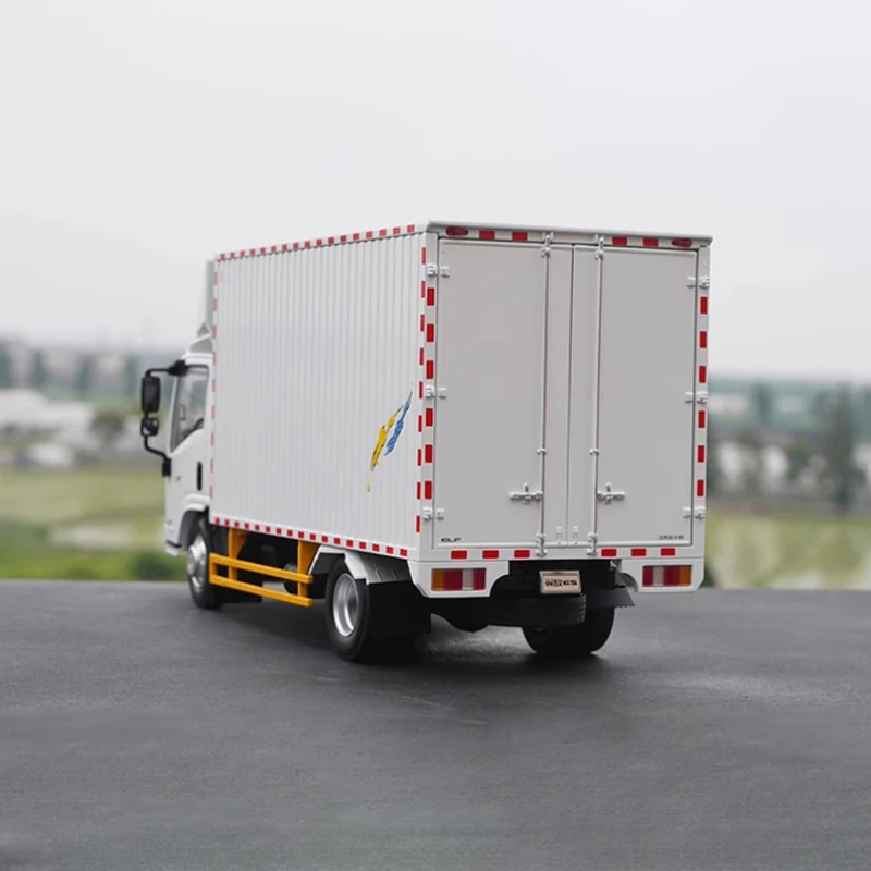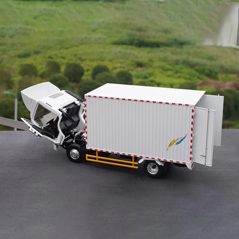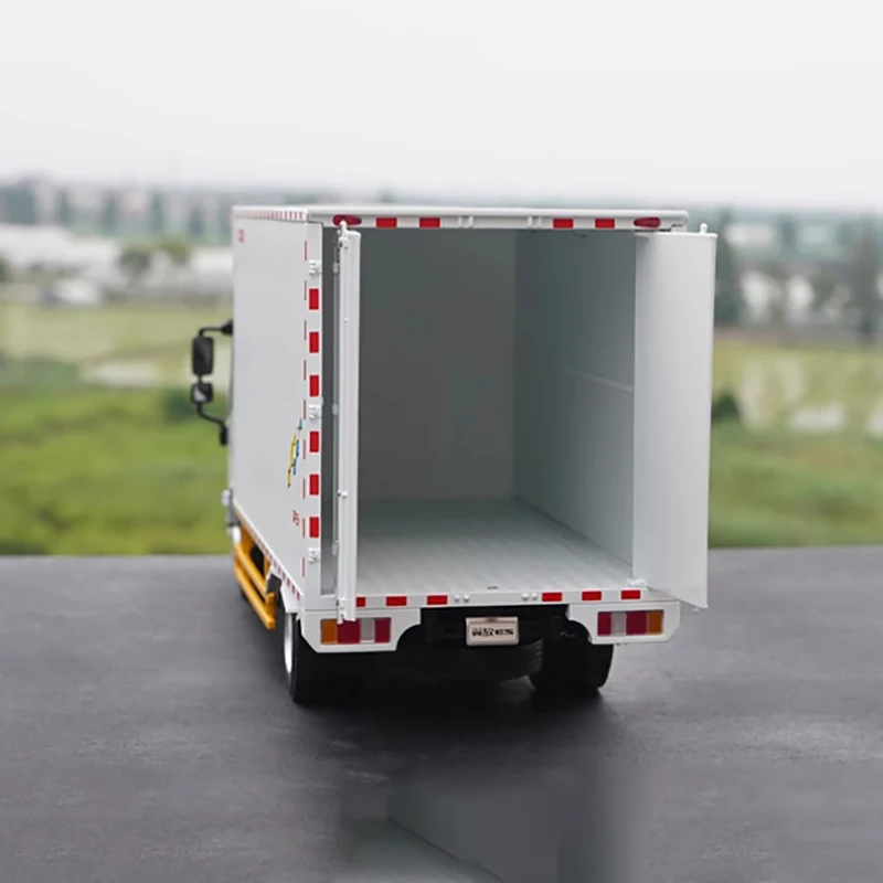 Experience the realism of a 1:18 scale diecast winged van light truck, measuring approximately 33 cm long, 11 cm wide, and 16 cm high. Crafted from alloy and ABS materials, this highly detailed static display model features a sleek white finish with a polished surface, realistic grille with horizontal lines, large rectangular headlights, extended side mirrors, proportionate door handles, and a corrugated cargo box adorned with reflective red and white stripes. Decorative yellow and blue decals add vibrant accents, while intricately detailed hubcaps and treaded tires enhance its lifelike appearance. Designed for adult collectors, this model is perfect for display and admiration.