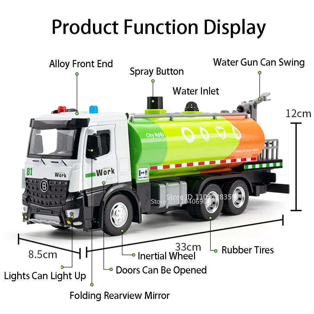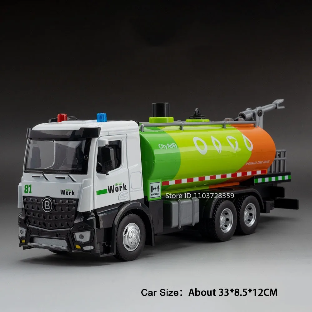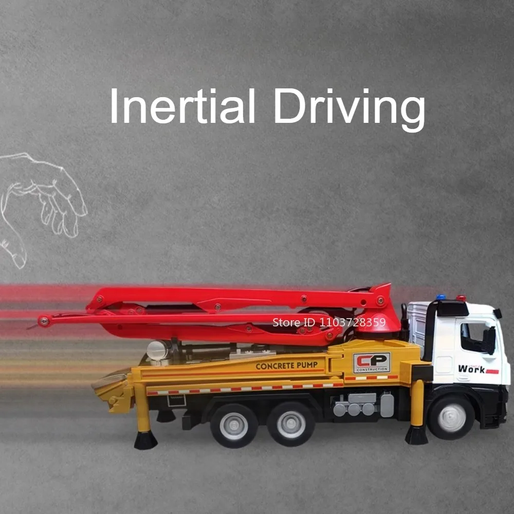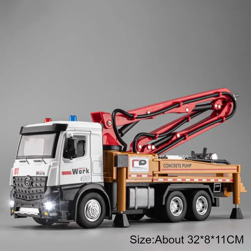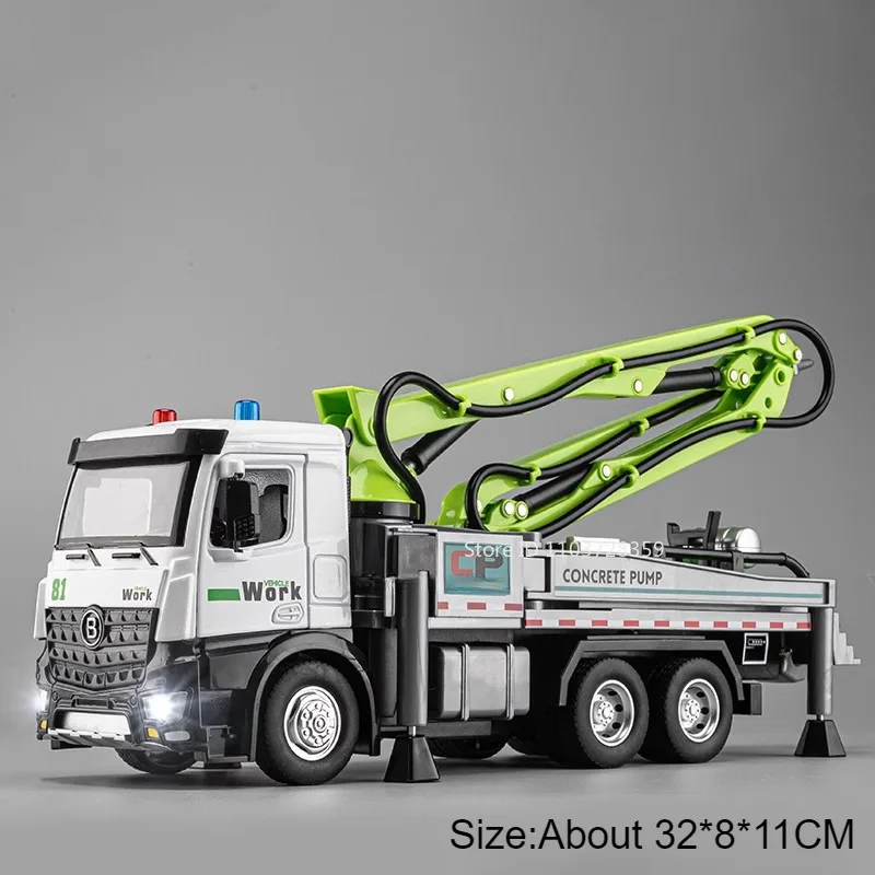 Experience the realism of the 1:24 scale diecast cement pump truck and sweeping truck models, crafted with a durable metal alloy body, plastic chassis, and textured rubber tires. The cement pump truck features a manually extendable and rotatable grouting arm, openable doors, and vibrant green or red color options. Both vehicles include light and sound functions, with impact-resistant construction designed for adult collectors and enthusiasts. Measuring approximately 32 x 8 x 11 cm for the pump truck and 33 x 8.5 x 12 cm for the sweeping truck, these highly detailed models offer a combination of authentic detailing and functional play features, perfect for display or hands-on appreciation.