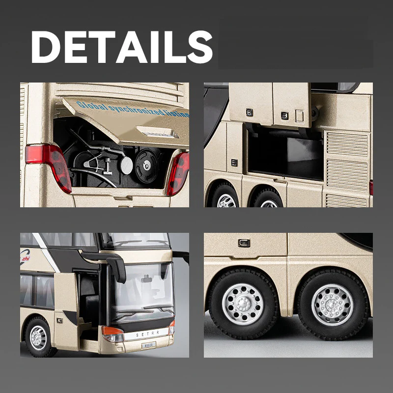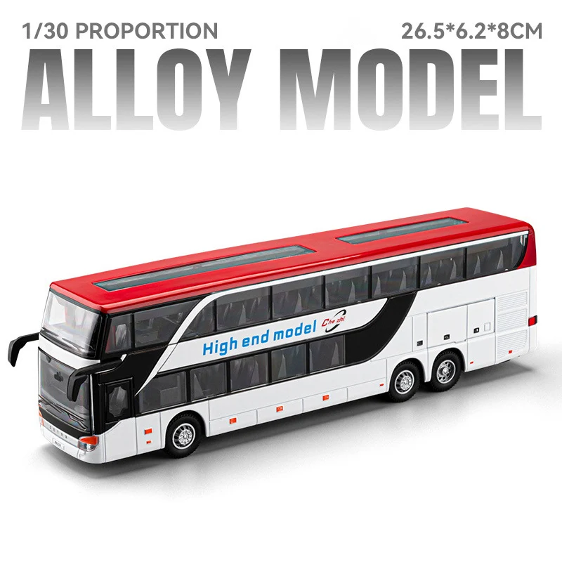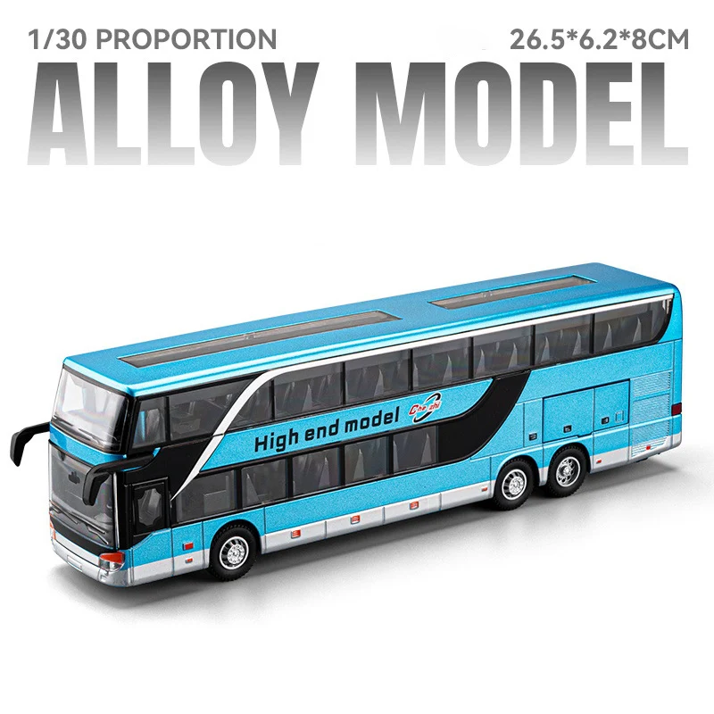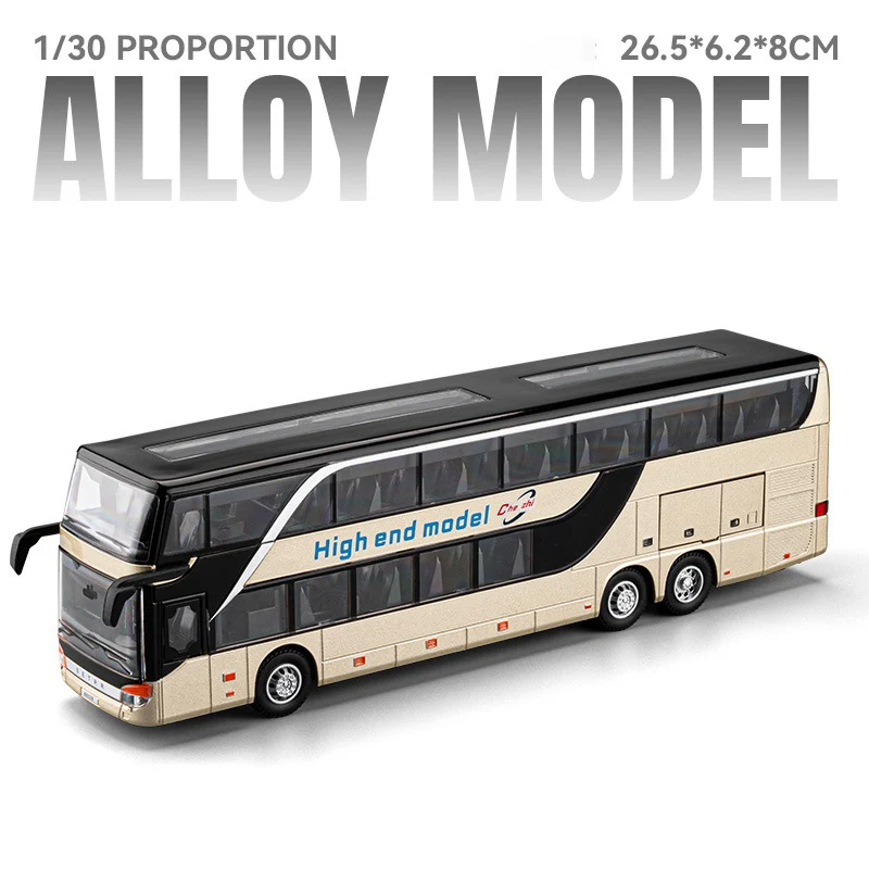 Experience the thrill of owning a highly detailed replica of a classic long-distance double-decker bus with this 1:30 scale alloy model. Crafted from durable diecast metal with intricate plastic components, this model captures the sleek, elongated body, realistic windows with black framing, and a large panoramic curved windshield. The color options include striking blue, elegant gold, and vibrant red, allowing you to choose the appearance that best suits your style. Its sophisticated design features metallic silver accents outlining separation lines, meticulous door and side mirror details, realistic tread-patterned wheels, and front headlights with integrated orange turn signals. This model is perfect for display or imaginative play, bringing a touch of realism and elegance to your collection.