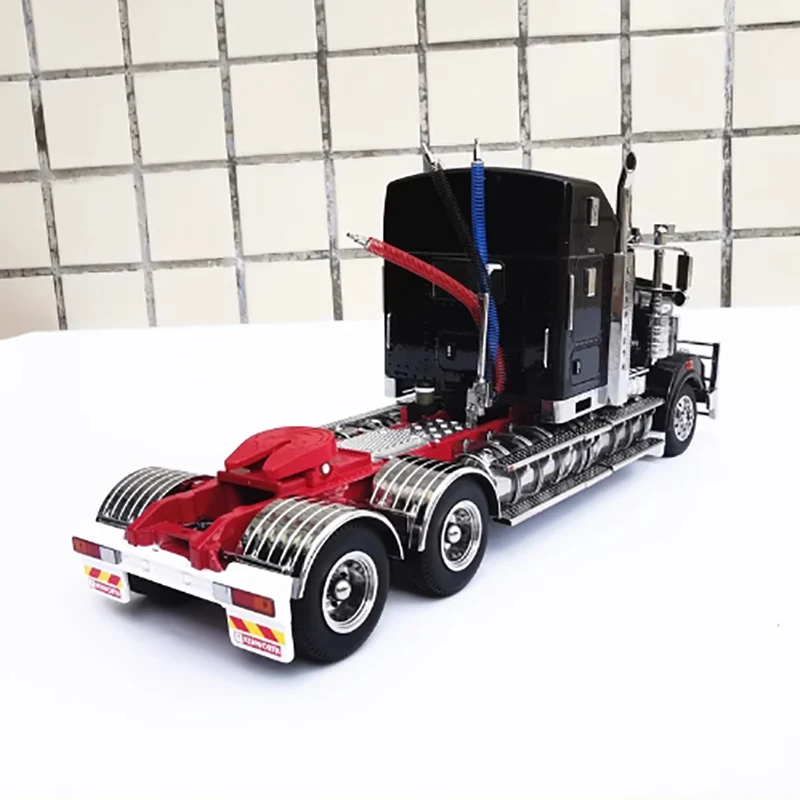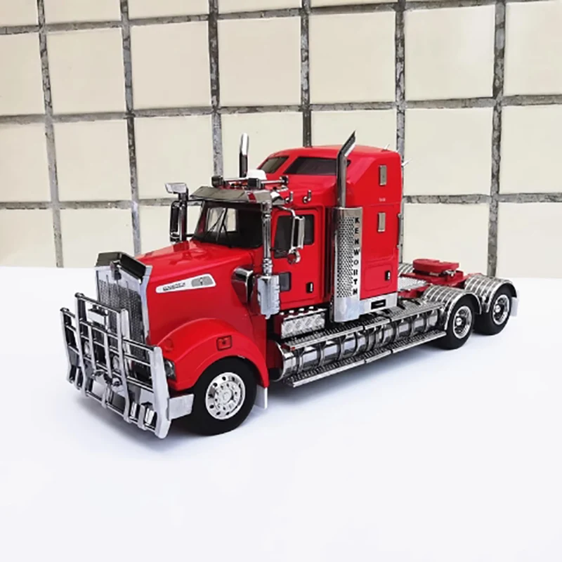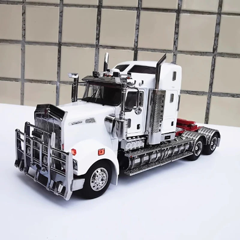 This highly detailed 1/32 scale diecast model of a Kenworth T909 prime mover is crafted from alloy and plastic, showcasing a realistic metallic finish with a white, matte or slightly glossy cab featuring angular, boxy design lines. The vivid red chassis contrasts with the cab, highlighting fuel tanks, side steps, and storage compartments with meticulous detail. Equipped with large black rubber tires mounted on silver hubs and vibrant red, blue, and black wires extending from the underside, this static ornament emphasizes durability and authenticity. Perfect for collectors, enthusiasts, or as a decorative gift, it offers precise craftsmanship and comes in four color variations—A, B, C, and D—making it a striking display piece.