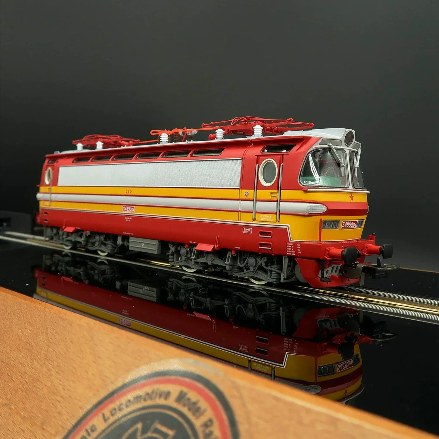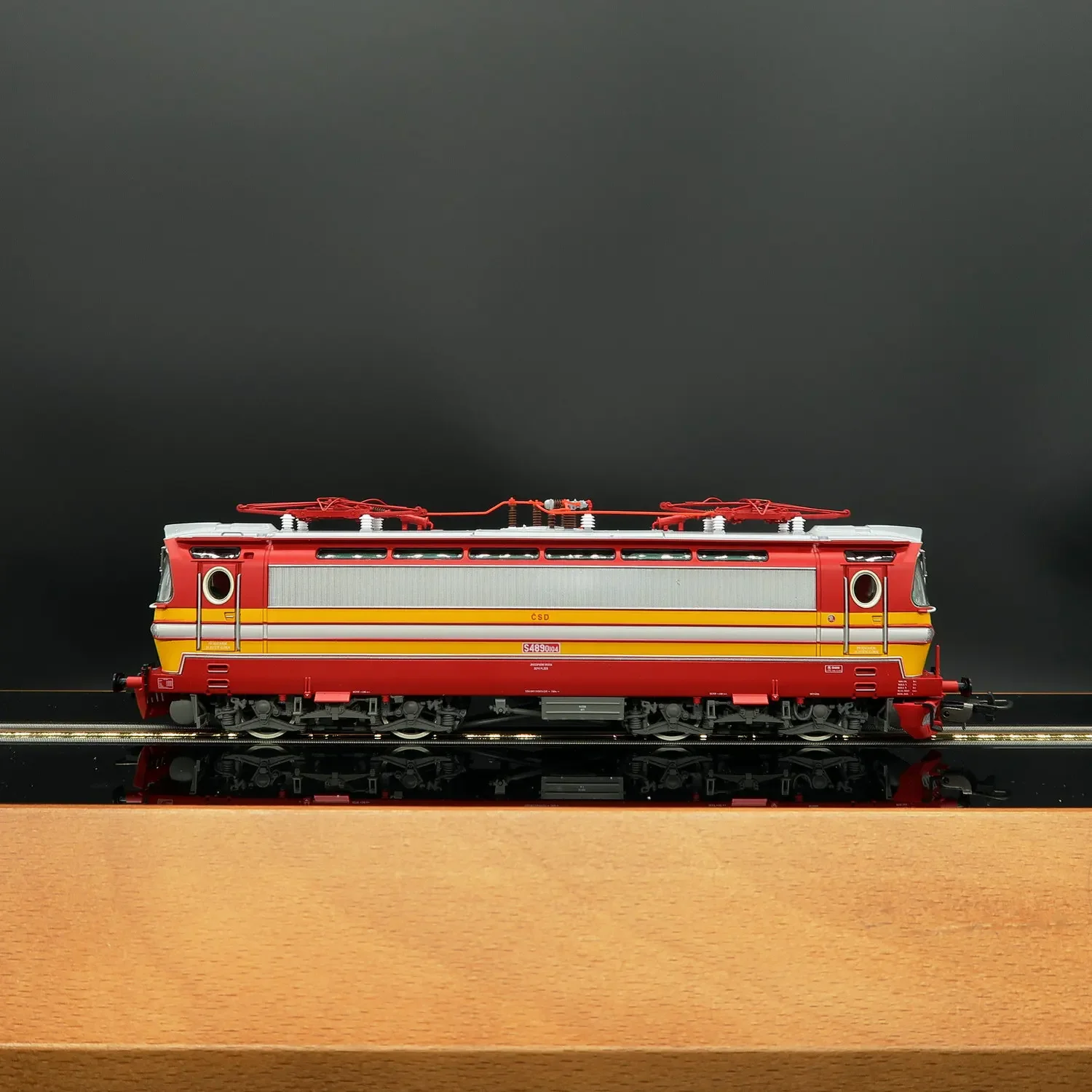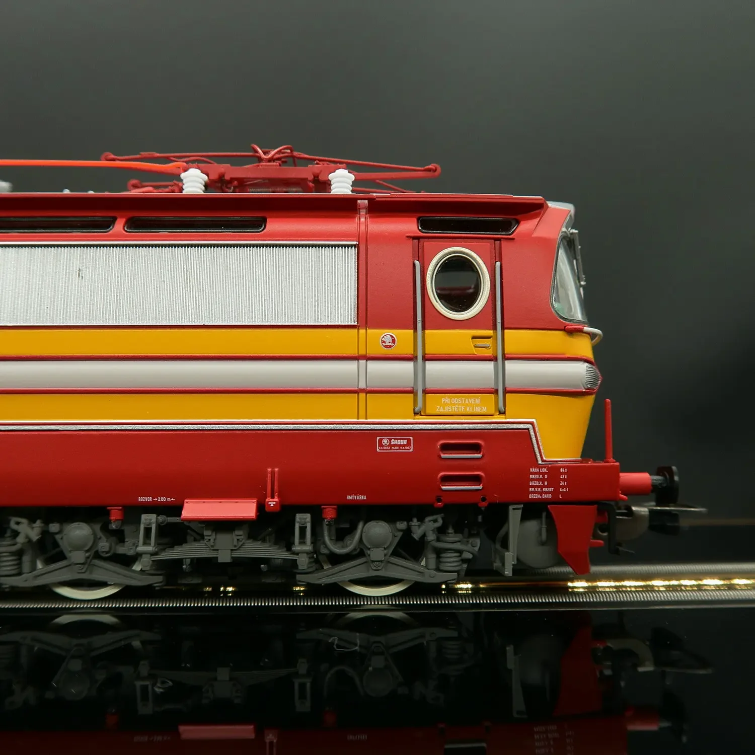 - Roof equipped with detailed red pantograph, insulators, and wiring, enhancing the technical realism of the miniature.