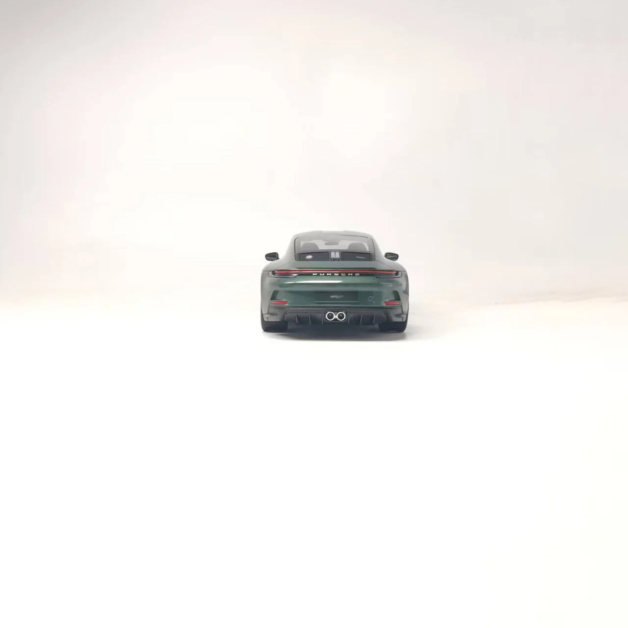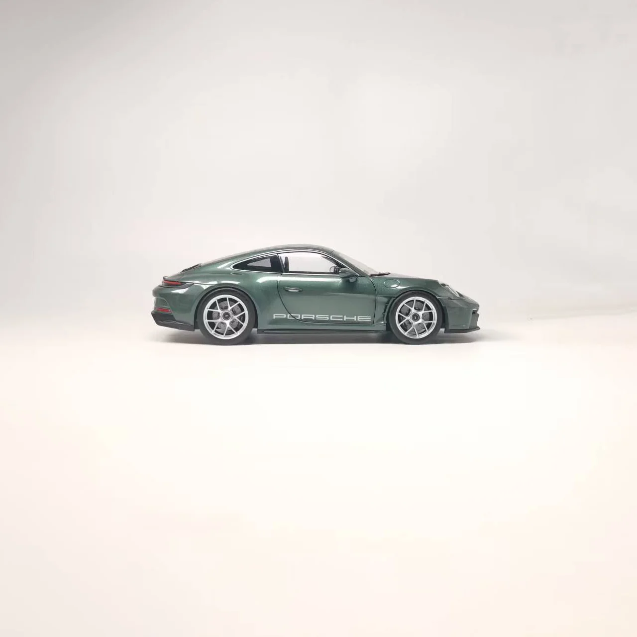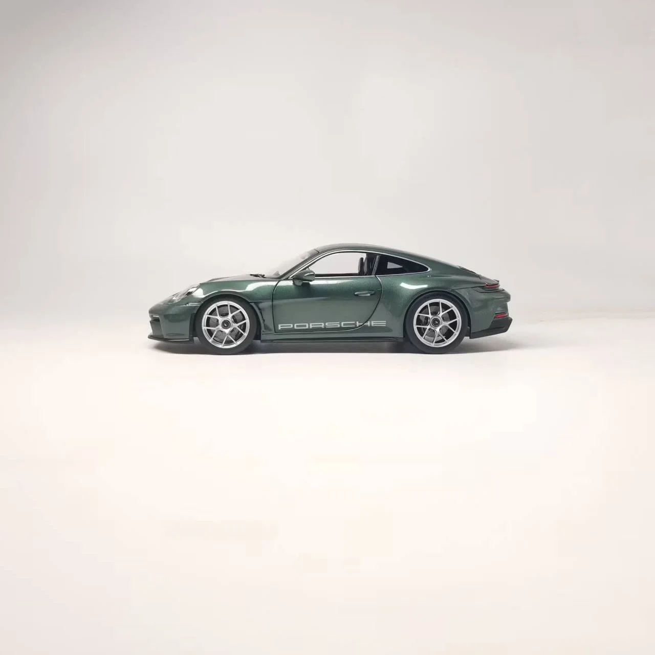 Immerse yourself in the elegance of this highly detailed miniature Porsche 911 S/T 2023. Crafted in a stunning metallic green with a glossy finish, this 1:18 scale die-cast model beautifully captures the sporty and aerodynamic essence of the original vehicle. The precise contours, wide wheel arches, and sleek roofline highlight its modern and dynamic design. Every element, from the intricate multi-spoke silver rims to the carefully rendered body lines, exudes superior craftsmanship. Despite minor surface rashes on the paint, this replica authentically reflects the high-quality aesthetic of a true collector’s piece, making it an ideal addition to your collection or a sophisticated gift for enthusiasts who appreciate fine automotive artistry.