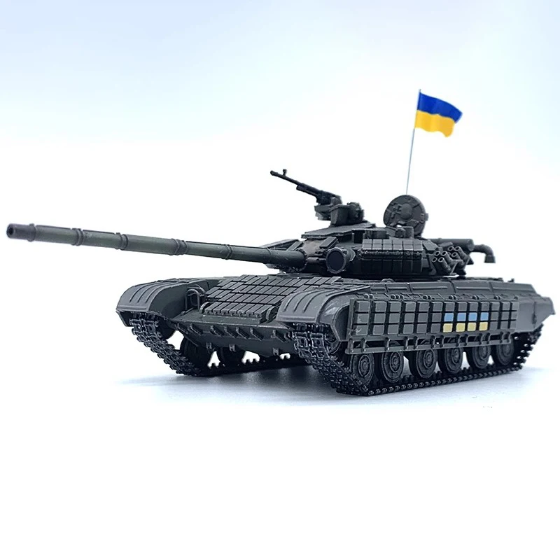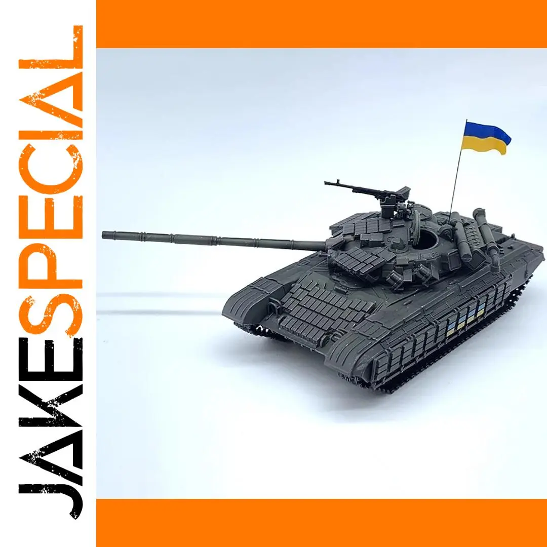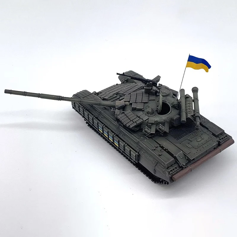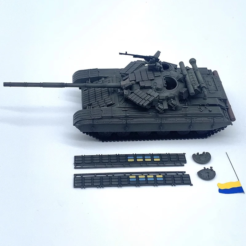 Step into the world of military history with this meticulously crafted T-64BV model. Measuring approximately 9-10 cm in length, this 1:72 scale replica offers an impressive level of detail, from the textured surface with panel lines and rivets to the layered side armor. Its dark gray or black finish enhances its realistic military aesthetic, highlighting the tank's tactical appearance. The turret is finely sculpted, featuring hatches, antenna mounts, and subtle protrusions, while the long barrel with ridges adds mechanical authenticity. A small Ukrainian flag attached to the rear flagpole provides a subtle hint of color, making it a striking display piece. Its fragile construction emphasizes craftsmanship, perfect for collectors and enthusiasts seeking an authentic miniature.