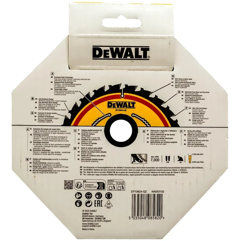 Experience professional-grade cutting with the DEWALT DT10624 woodworking saw blade, featuring a 165mm diameter, 20mm arbor, and 24 teeth. Crafted for precise ripping and cross-cutting of plywood, MDF, chipboard, and natural timber, it offers up to twice the lifespan of standard blades thanks to its aggressive multi-tooth design and premium C3 grade carbide that can be resharpened up to three times. Reinforced with anti-kickback features for impact resistance and durability, this blade delivers fast, accurate results, optimizing your cordless power tool’s efficiency, especially with Flexvolt batteries. Perfect for demanding carpentry projects that require reliable, long-lasting cutting performance.