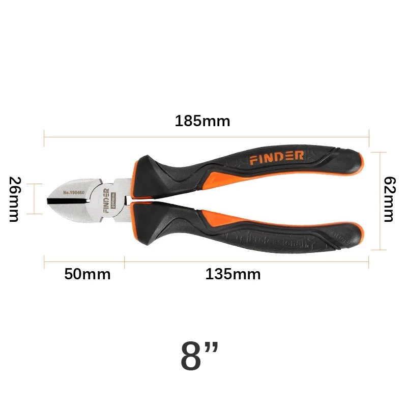 Experience the reliability and craftsmanship of this pair of diagonal pliers, designed to meet the needs of professionals and DIY enthusiasts alike. Available in 6-inch (160mm) and 8-inch (185mm) sizes, these tools feature high carbon steel blades with HRC hardness between 46 and 52, ensuring durability and precise cutting performance. The shiny silver blades have a flat, sharp-edged profile, perfect for cutting wires up to 2mm in diameter. The ergonomic black TPR plastic handles with vibrant orange accents provide a comfortable, non-slip grip, making extended use effortless. Whether you're cutting, crimping, stripping, or nipping wires, this multifunctional tool offers exceptional control, strength, and efficiency for your electrical or craft projects.