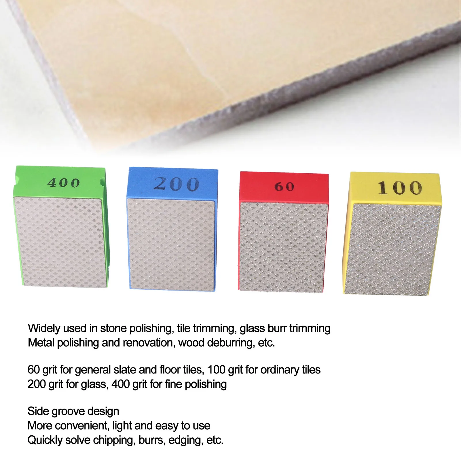 - Suitable for various applications including stone polishing, tile trimming, glass burr removal, metal finishing, renovation, and wood deburring, providing versatile use in multiple projects.