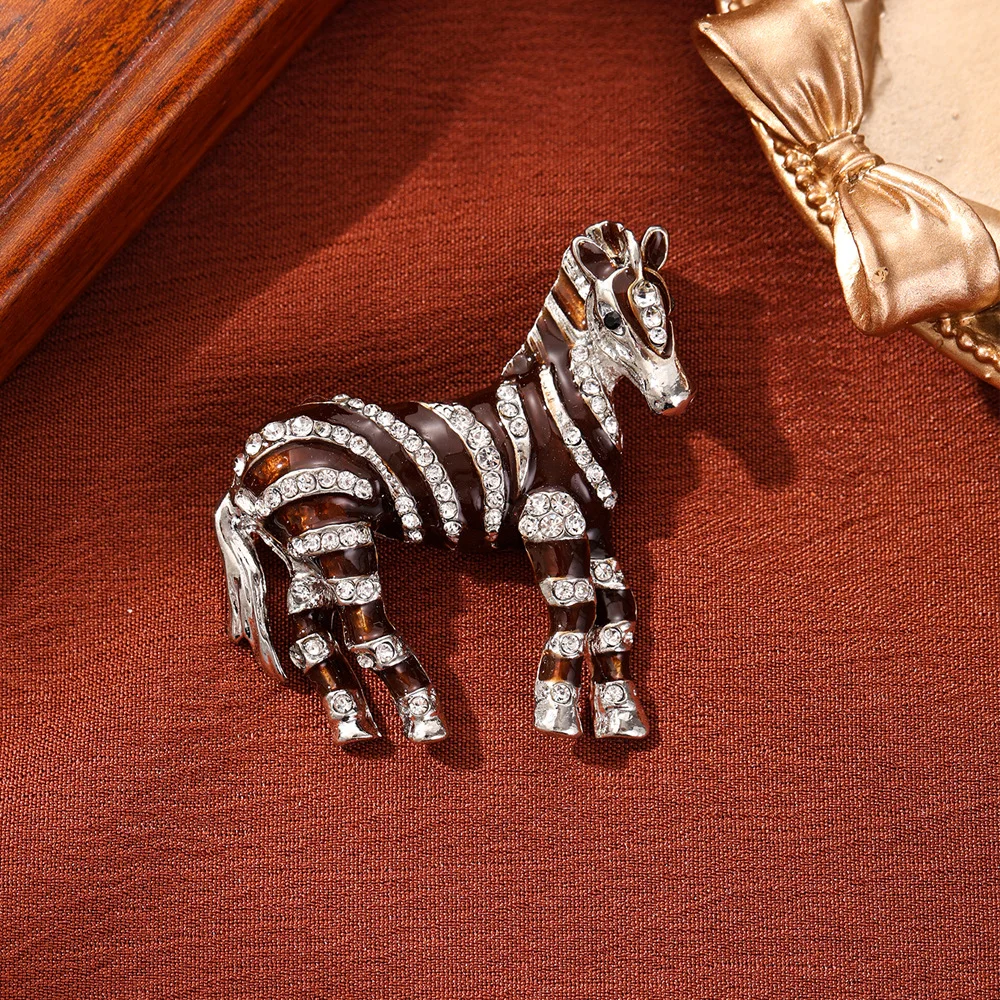 This three-dimensional zebra brooch is an eye-catching accessory that combines a unique design with elegant details. Crafted from sturdy alloy, its gleaming surface showcases alternately glossy dark brown and metallic silver stripes, enhanced by sparkling rhinestones for a luxurious touch. Measuring 4cm by 4.5cm, this brooch is designed for unisex wear, fitting seamlessly into retro, trendy, or military-inspired outfits. Picture yourself pinning it onto your favorite jacket or bag, instantly elevating your style while enjoying the compliments it brings. The zebra's upright posture embodies vitality, making it a dynamic addition to any ensemble.
