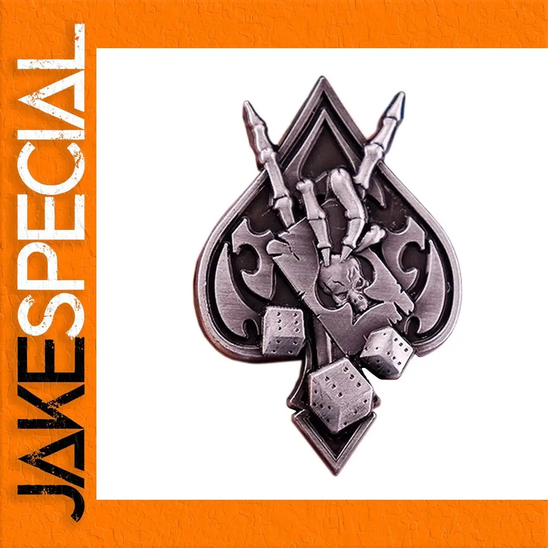 This striking brooch features a compelling design that fuses a skull with a playing card motif and dice, epitomizing retro, punk, and gothic aesthetics. The intricate details include a skeletal hand gripping the skull, paired with two dice underneath. Its spade-shaped backdrop enhances the gambling theme and adds a touch of boldness. Crafted from high-quality alloy, this silver brooch has a polished yet rugged look, making it an eye-catching accessory for a variety of uses. Measuring approximately 3 cm, it is versatile enough for jackets, backpacks, hats, or DIY clothing projects, seamlessly blending vintage charm with modern subculture influences.