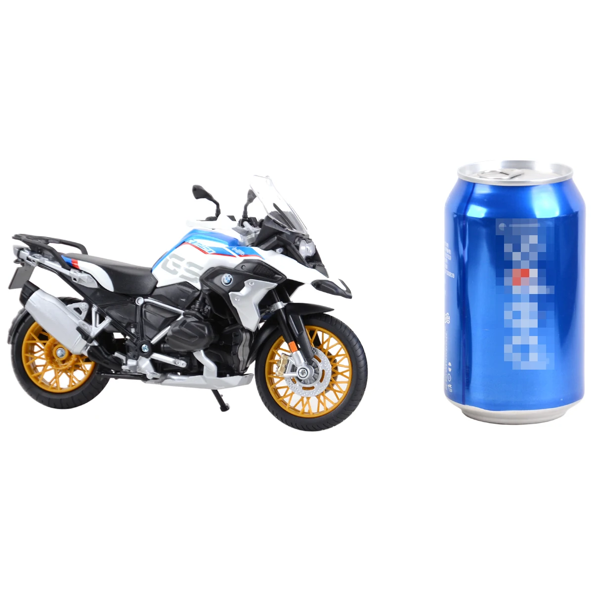 Experience the thrill of owning this highly detailed die-cast BMW R1250 GS motorcycle model, measuring approximately 18.5 cm in length, 8.2 cm in width, and 11.8 cm in height. Crafted with precision, the model combines die-cast metal with plastic parts, with the fuel tank expertly made from metal for added realism. The vibrant design features eye-catching blue, red, and white racing stripes and the iconic BMW logo. The sleek, rugged appearance captures the sporty essence of the original bike, complete with LED-like headlights, black handlebar grips, and textured black seat. Its authentic mechanical details, such as spring-loaded rear suspension and free-rolling wheels, make it a perfect collectible item for motorcycle enthusiasts and dedicated hobbyists alike.