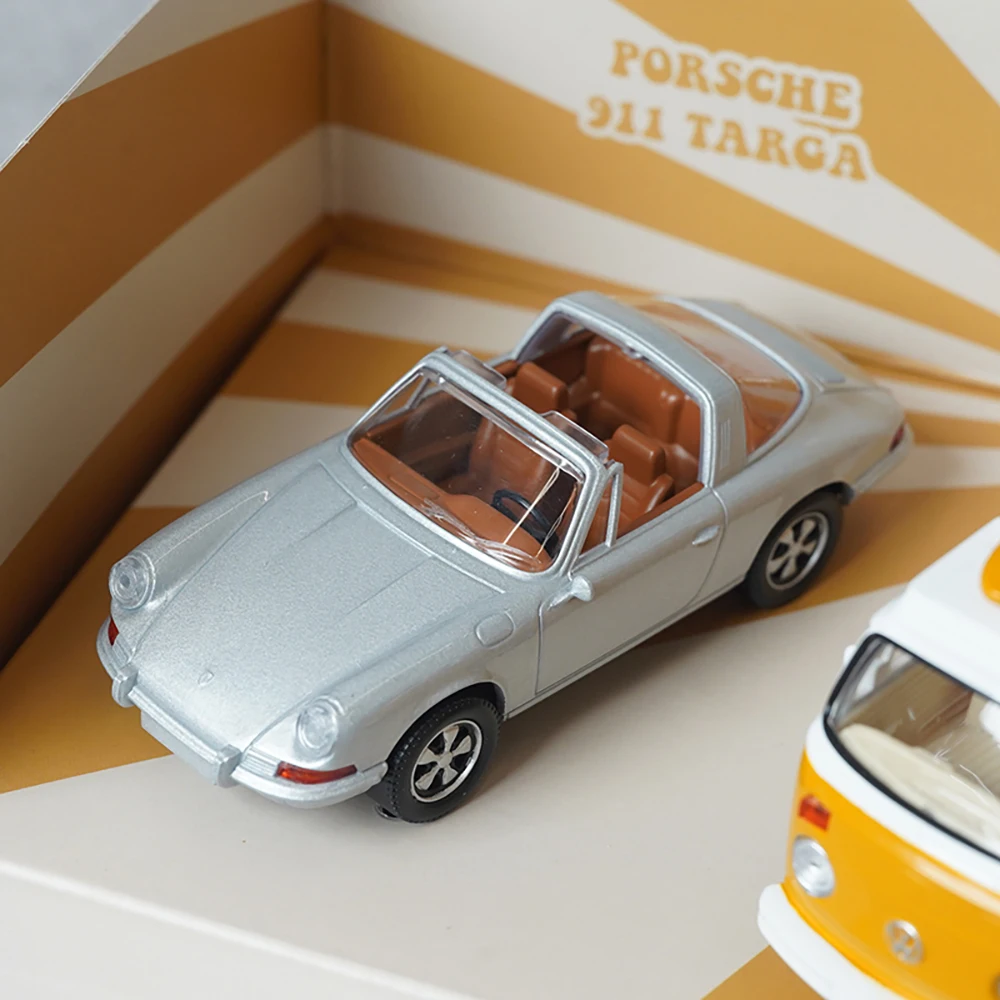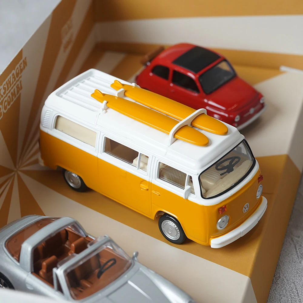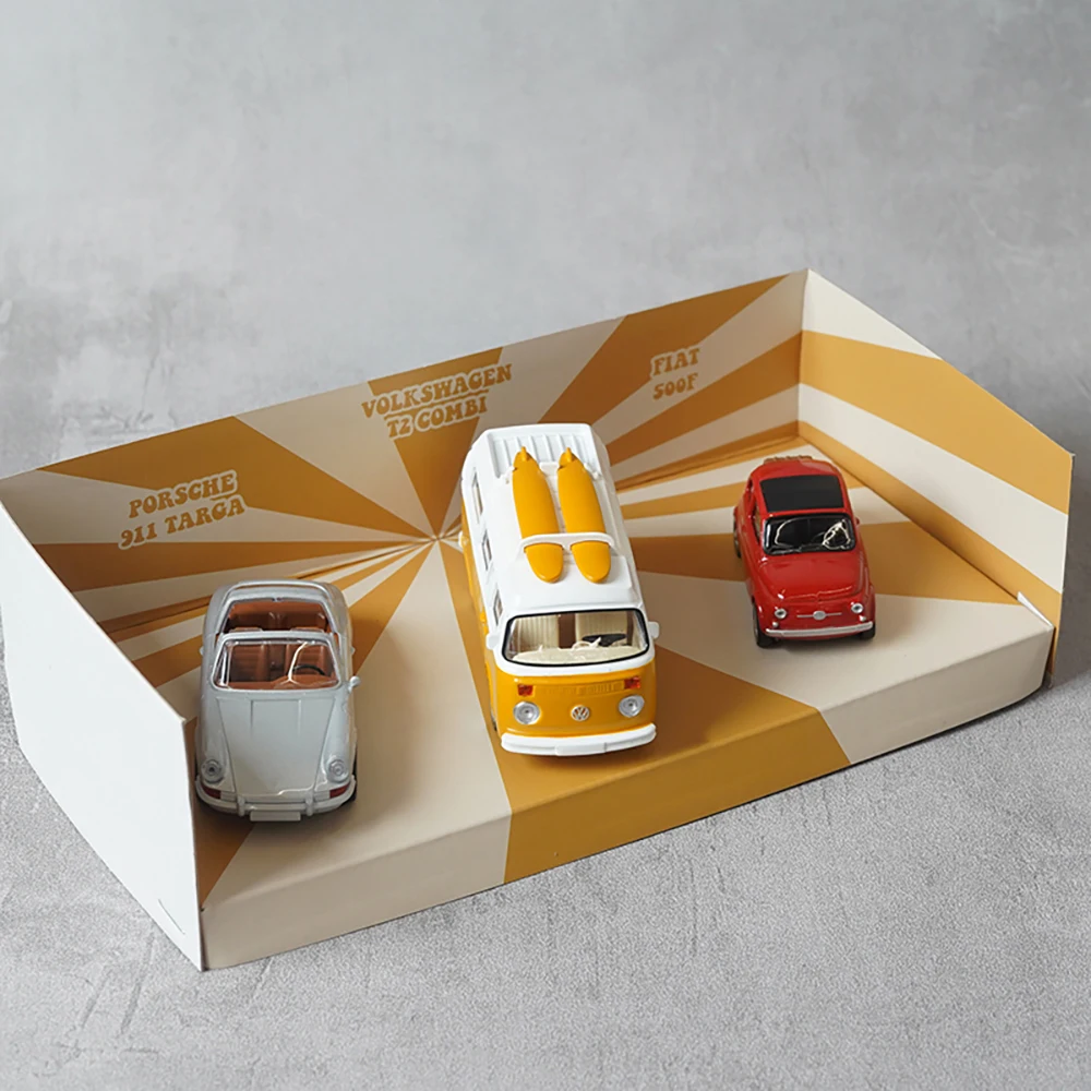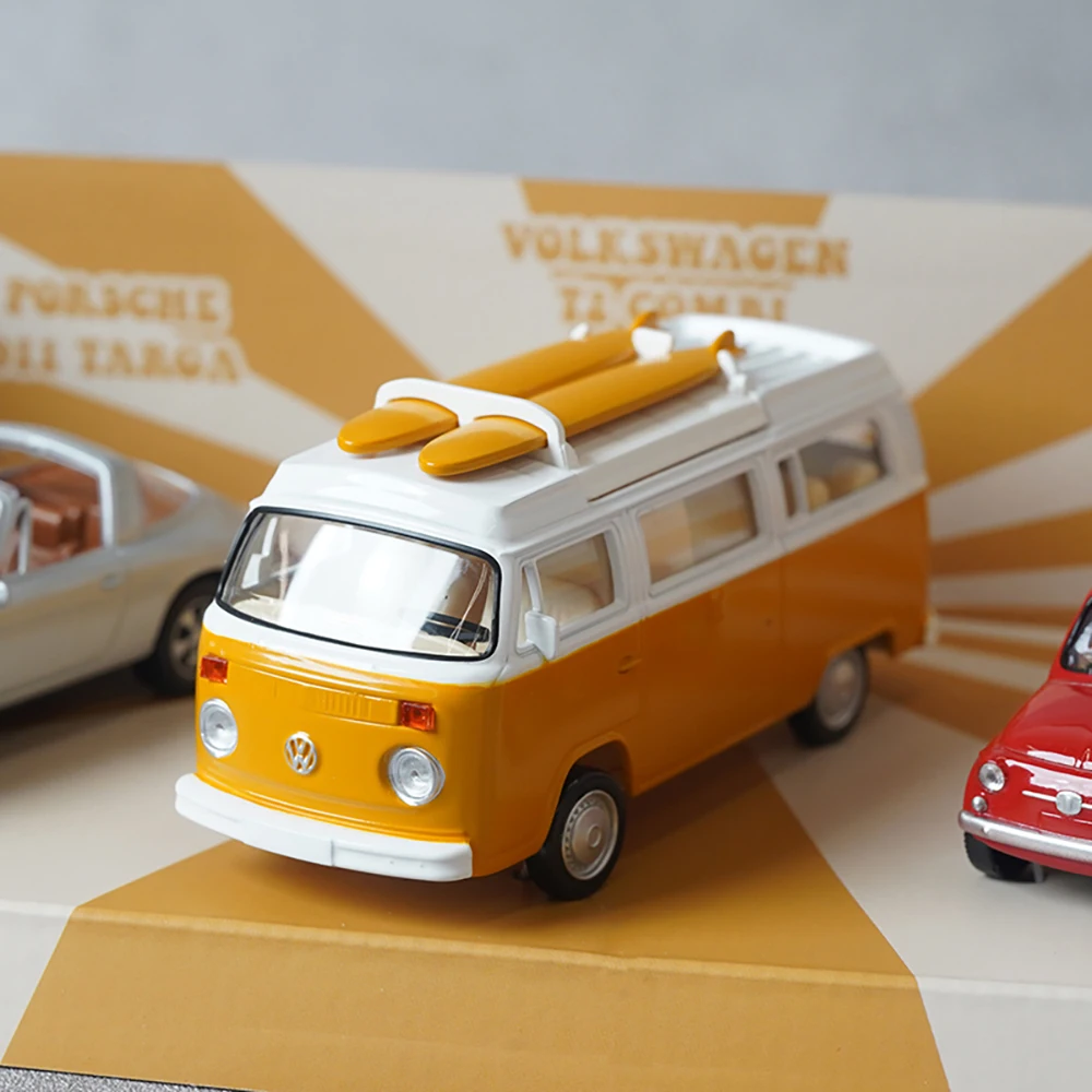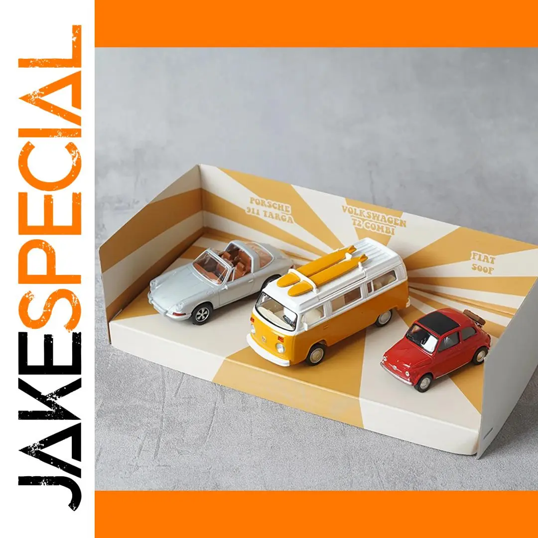 - Includes three meticulously crafted models: Porsche Targa, Volkswagen T2b camper van, and Fiat 500, all in vibrant, eye-catching colors for collector appeal.