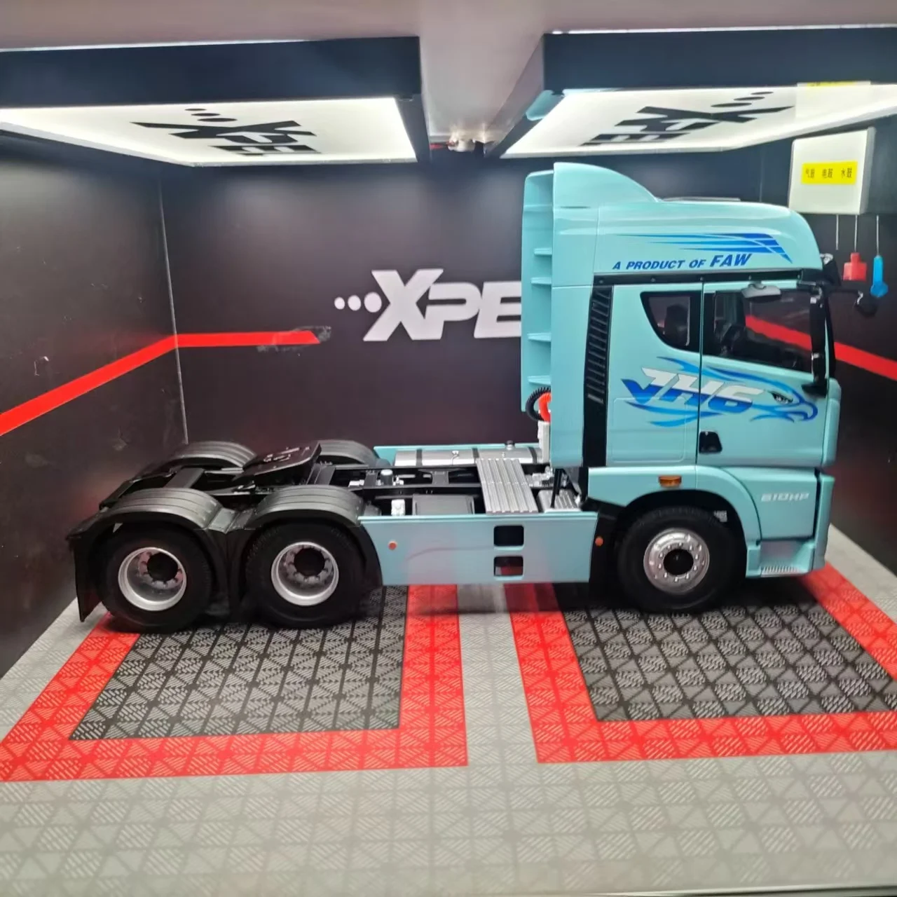 Enhance your collection with this highly detailed 1:24 scale die-cast FAW Jiefang JH6 tractor trailer head. Crafted from alloy, plastic, and rubber, it features functional opening doors and hood, with the front liftable for added realism. The vibrant metallic light blue finish highlights smooth, aerodynamic contours, detailed grille, gold-accented emblem, and transparent windows revealing interior details. Six realistic rubber tires with intricate rims, black door handles, side mirrors, and roof aerodynamic fittings complete this high-end collectible. Perfect for display, gifting, or admiration, this model captures the essence of realistic truck design, with minor paint imperfections adding authentic charm—making it an exceptional addition for enthusiasts aged 14 and above.