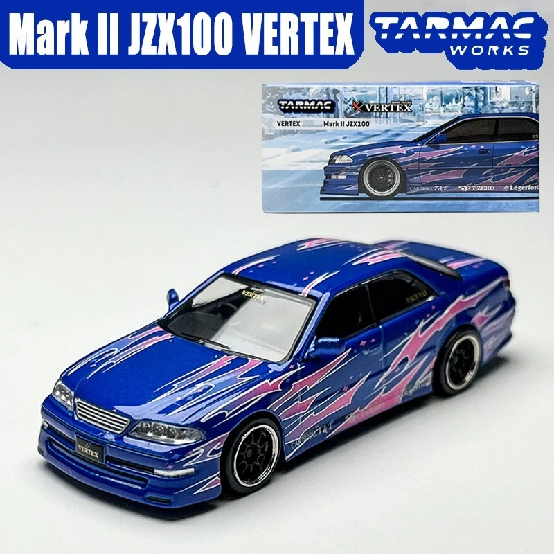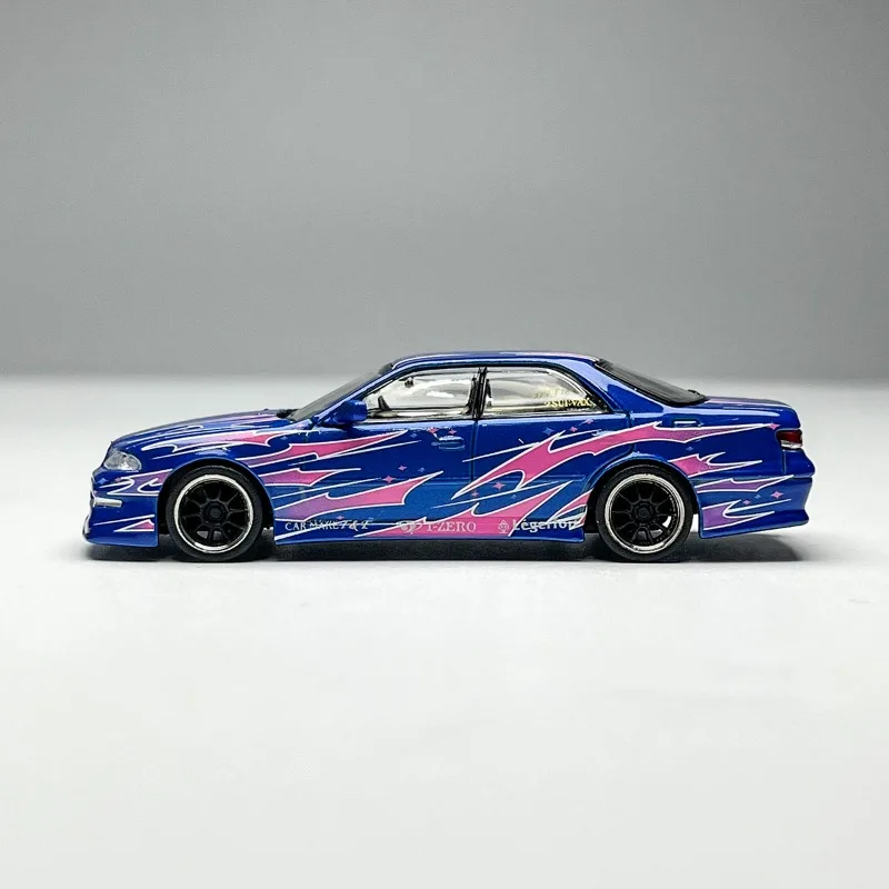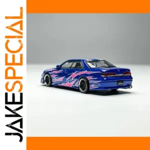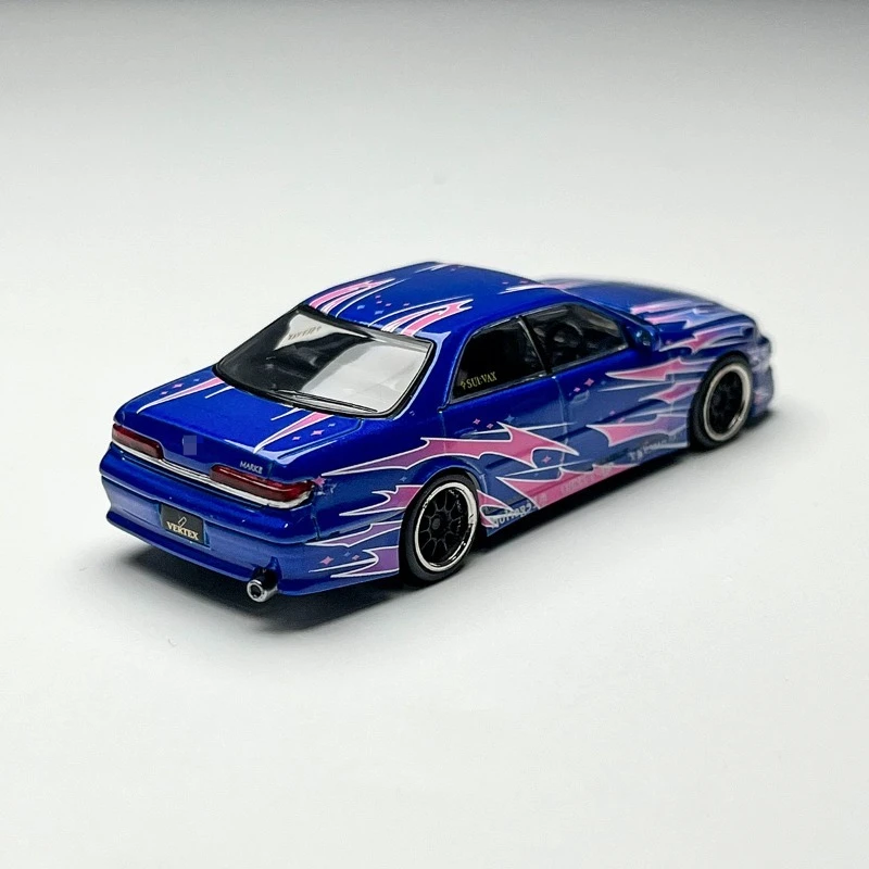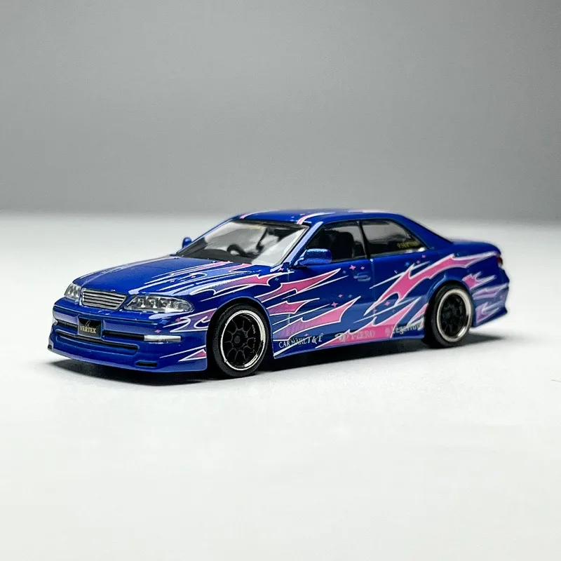Experience the excellence of the Takara Tomy 1:64 scale die-cast model of the Toyota Mark II JZX100 VERTEX, crafted from durable metal with a glossy, vibrant blue body (color code T64G-024-BL). This collectible features bold pink and white decals that run along the sides and over the roof, enhancing its sporty appeal, along with realistic black multi-spoke wheels with silver accents. The transparent windows reveal a detailed interior, while the rear showcases clear taillights and a subtle bumper with an exhaust pipe. Designed for display and enthusiasts, this high-quality model combines meticulous craftsmanship with a sleek, polished aesthetic—perfect for collectors seeking authenticity and style.